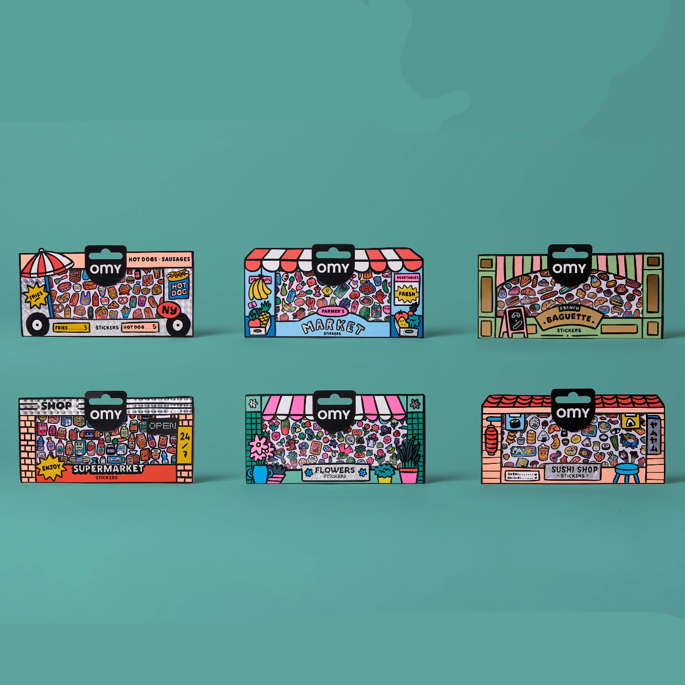 🛍 FABULOUS BOUTIQUE STICKERS ASSORTMENT A fun and colorful assortment featuring the 6 XS sticker sheets from the Fabulous Stickers collection, inspired by everyday shops and markets. Each sheet highlights a different theme — from Parisian cafés and sushi shops to bakeries and vibrant food stands.  Fluorescent, waterproof, and repositionable stickers — perfect for decorating notebooks, laptops, phones, or water bottles.