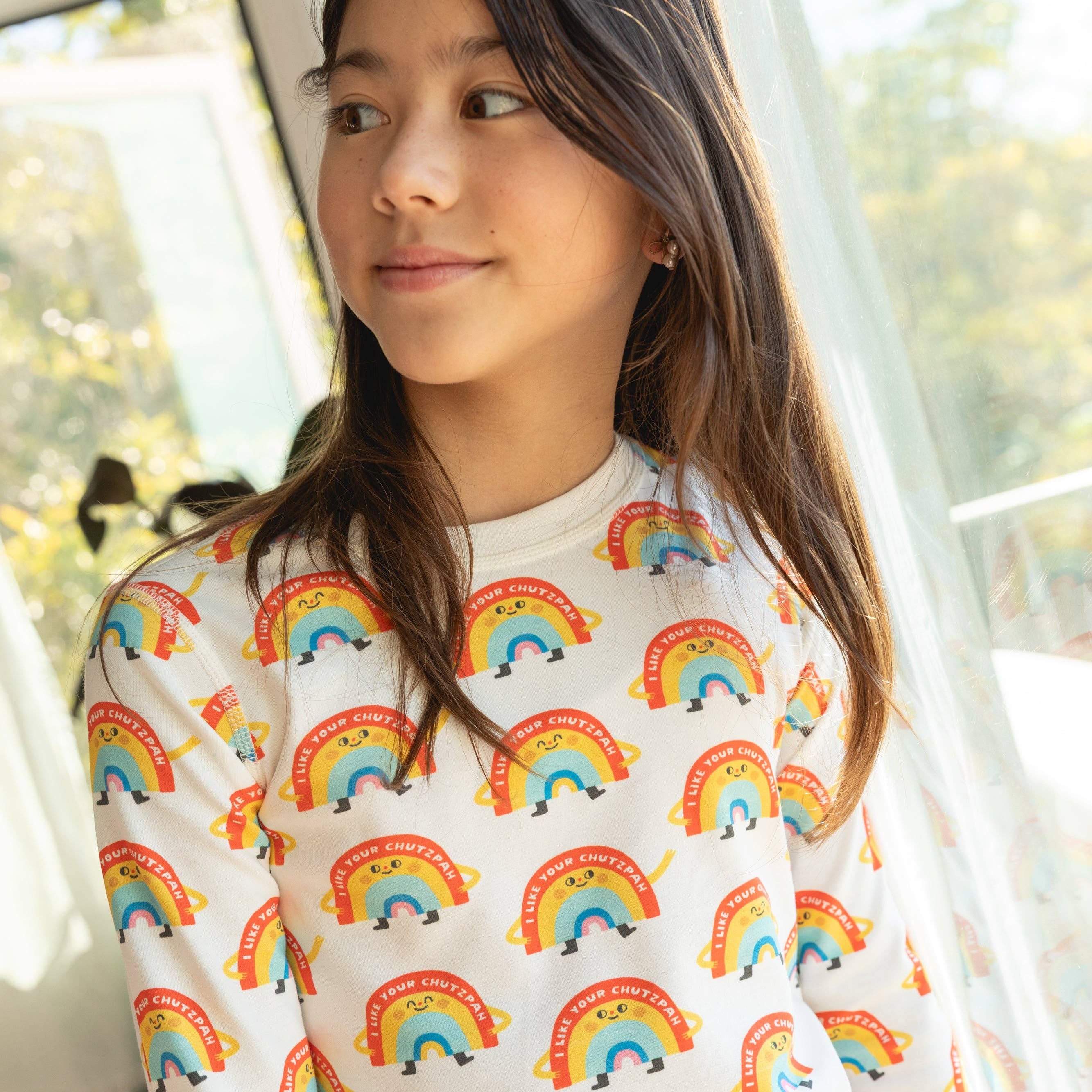This classic long-sleeved Dodo Banana pajama set is crafted from high-quality organic pima cotton and features Suzy Ultman’s playful “I Like Your Chutzpah” print for a joyful bedtime look. With its soft, breathable feel and whimsical design, it blends cozy comfort with timeless style.
