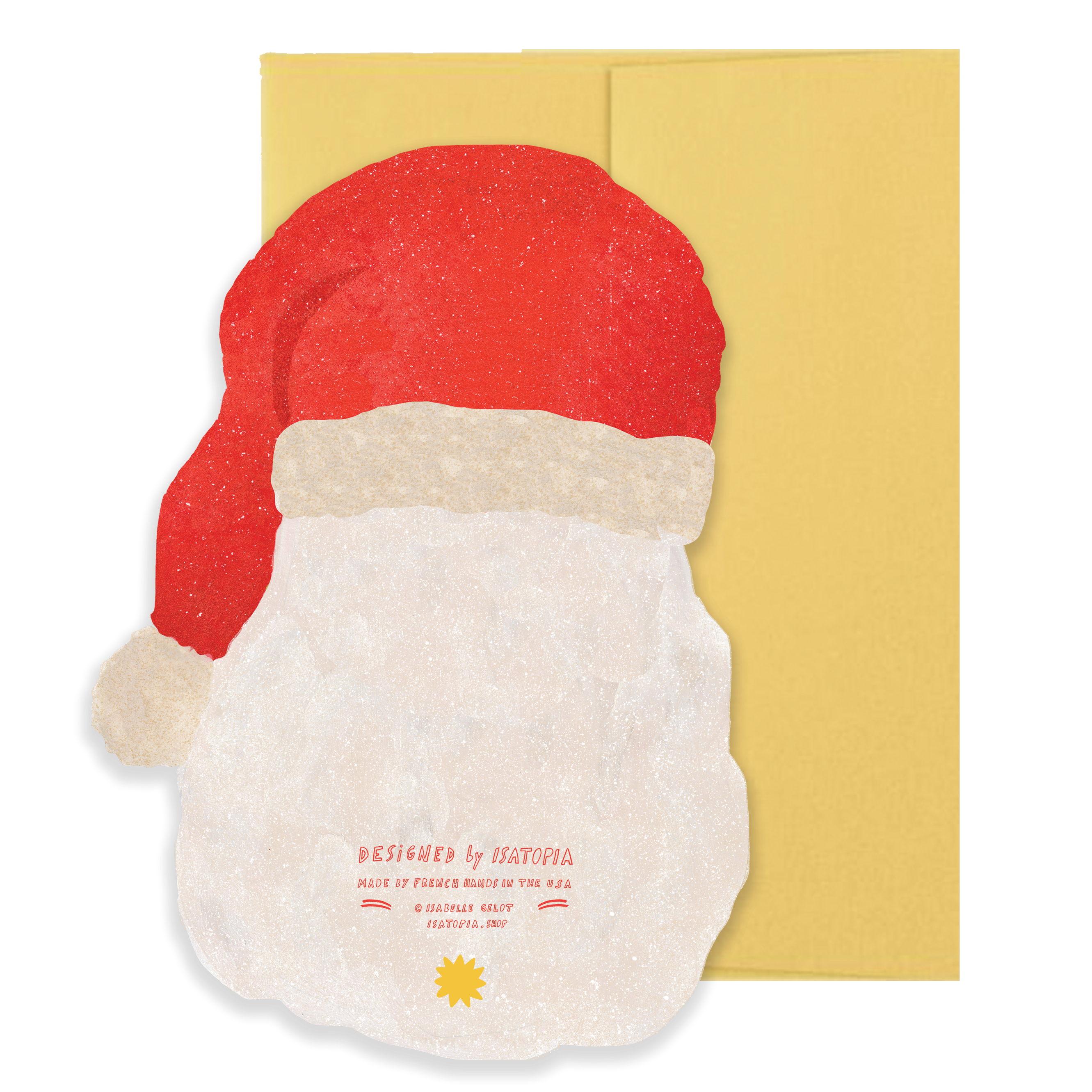The Santa Claus die cut card is part of the new Holiday collection - inspired by vintage Christmas ornaments. Comes with a bright festive gold envelope! A6 - 6.25"x4.5" die cut folded card, printed in the USA on sustainably produced 18pt coated card stock. Each folded card is blank inside, comes with a shiny golden envelope and is wrapped in a sustainable cello bag. Original illustrations by Isabelle. Made by French hands in the USA!