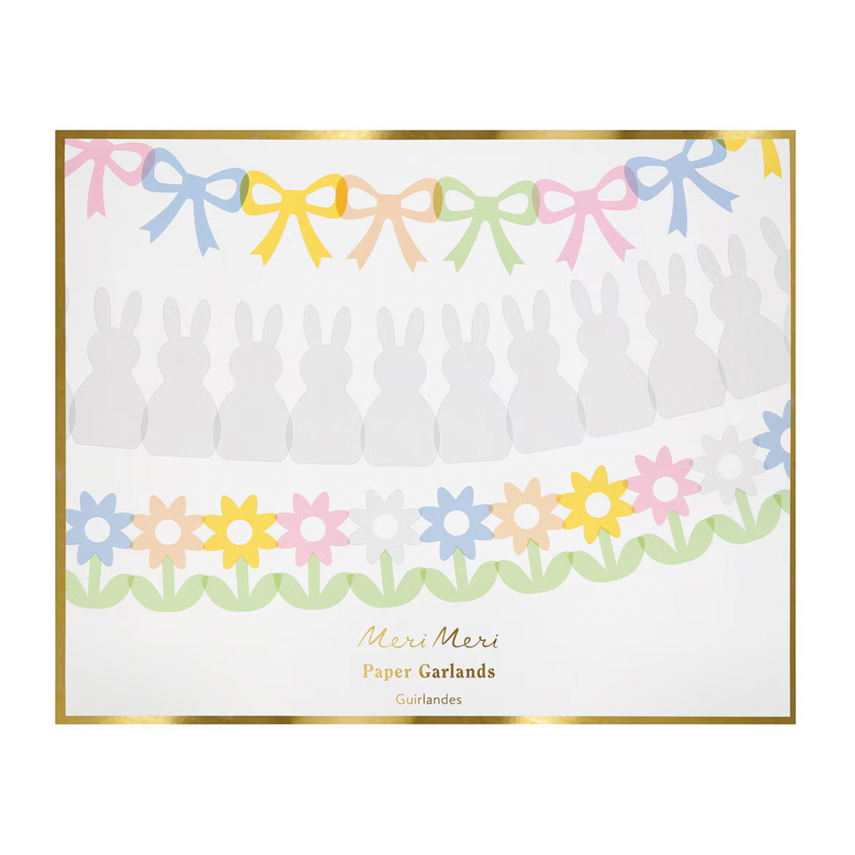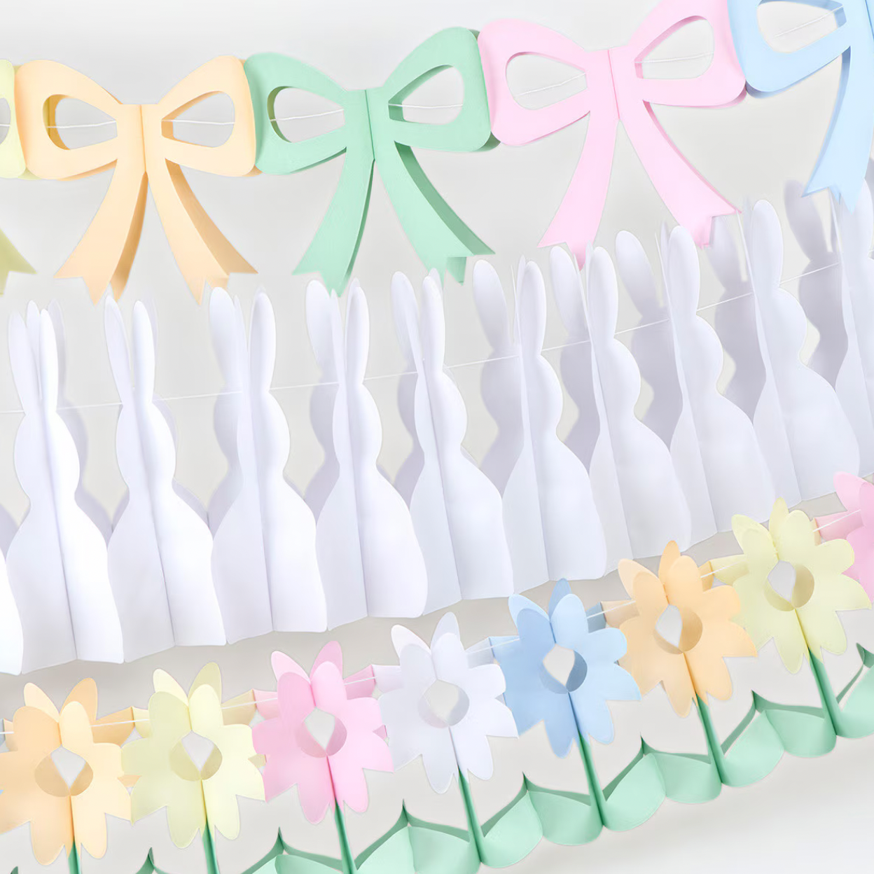 Celebrate Easter with a joyful burst of color and charm, thanks to this delightful set of three paper garlands. Featuring sweet bunnies, spring-fresh flowers and chic bows, they beautifully bring together everything we love about this season. Drape all three together for a layered statement look or hang separately on windows, doorways, mantels or in the garden to spread the cheer throughout your space. And when the celebration is over, simply pack them away to enjoy again year after year.