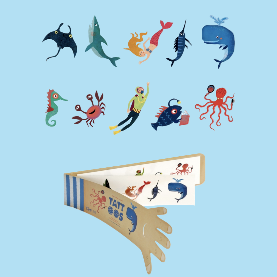 Sailors and sirens, it gives us great pleasure to introduce our fantastic ocean tattoos! They are safe, non-toxic, funny and made in Europe. Glub, glub, glub ...