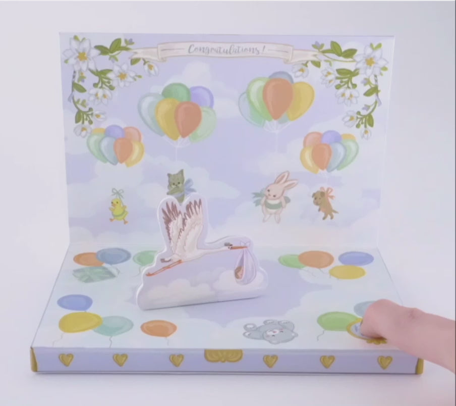 Open the Music Box Card to reveal a beautifully adorable, musical storytelling scene. Listen to the music and watch the baby and stalk magically float around and around to a classical lullaby. The front of the music box card looks like a conventional New Baby card, but opens to reveal a magnetic dancing character which moves around the card to the music when you press play. With a space to write a personal message on the back, every card also comes with a kraft board envelope.