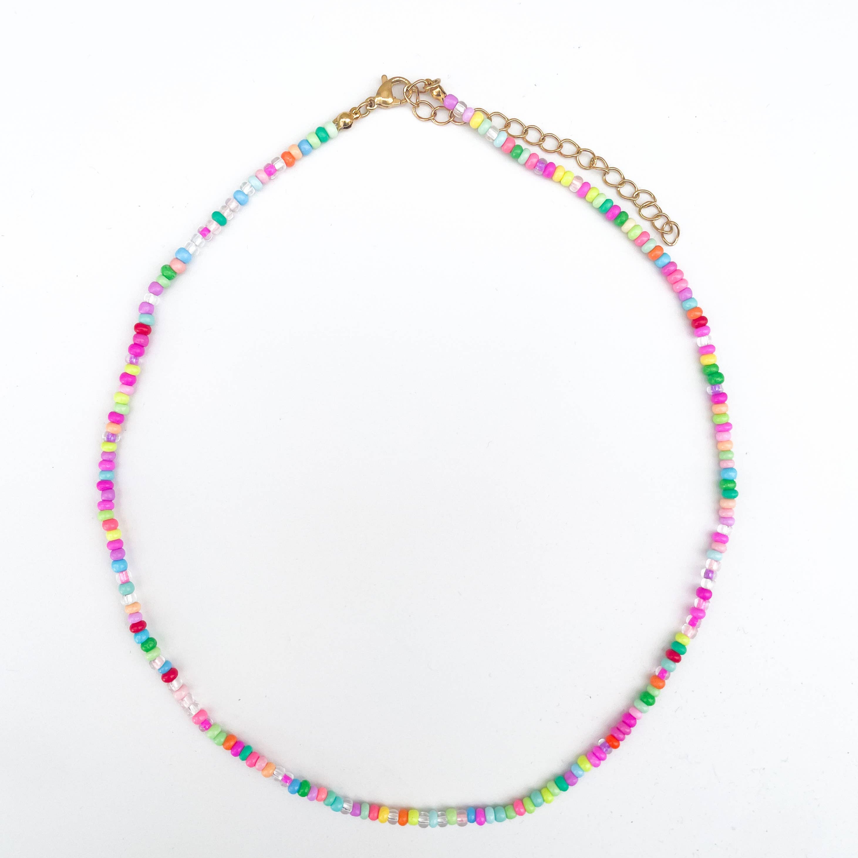 This adorable Rainbow Sprinkles Seed Bead necklace features a vibrant mix of gemstone beads. Each necklace features seed beads in various vibrant and pastel colors. The gemstones range from translucent to opaque and come in shades of fuchsia, baby pink, green, baby blue, lavender, yellow, orange, and white . Perfect for adding a touch of color and charm to any outfit!