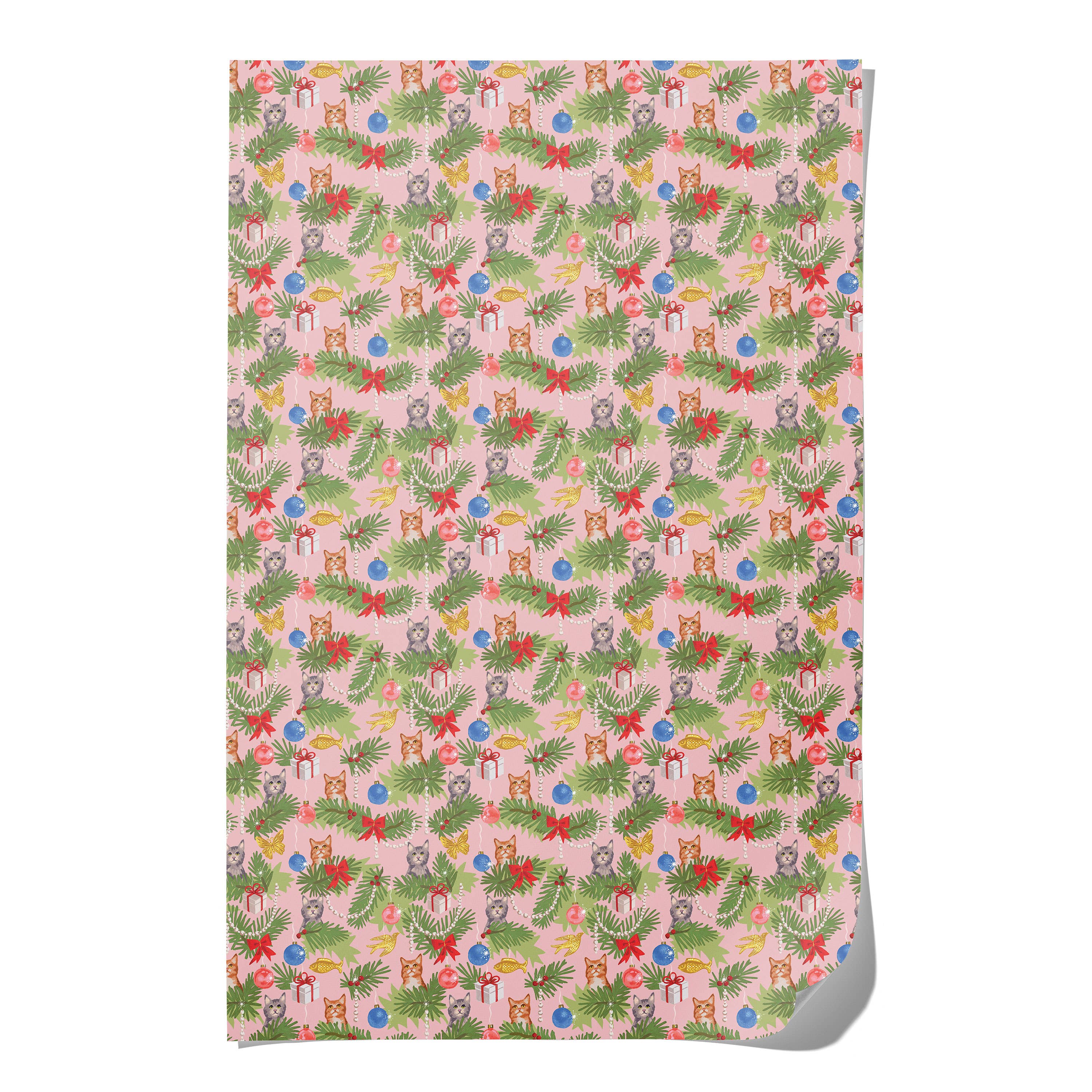 • Gift wrap with a festive design featuring cats, trees, and ornaments on a pink background.