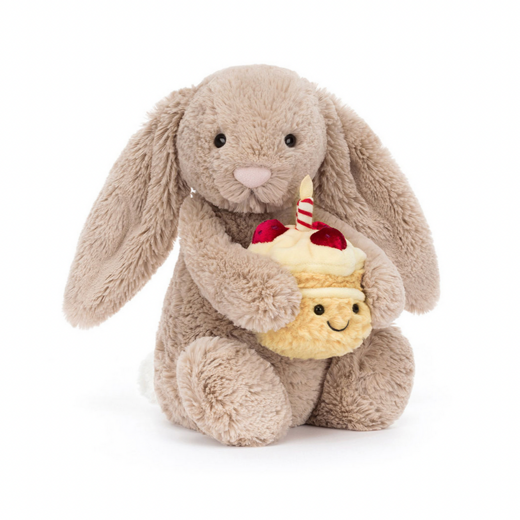 Invite Bashful Beige Bunny ‘Birthday’ along for the most joyful celebrations. Soft and sweet in beige fur, our iconic Bashful Bunny is holding a tiny, textured Amuseables Birthday Cake, topped with soft cream icing, velveteen strawberries, and a striped candle already lit with a suedette flame.