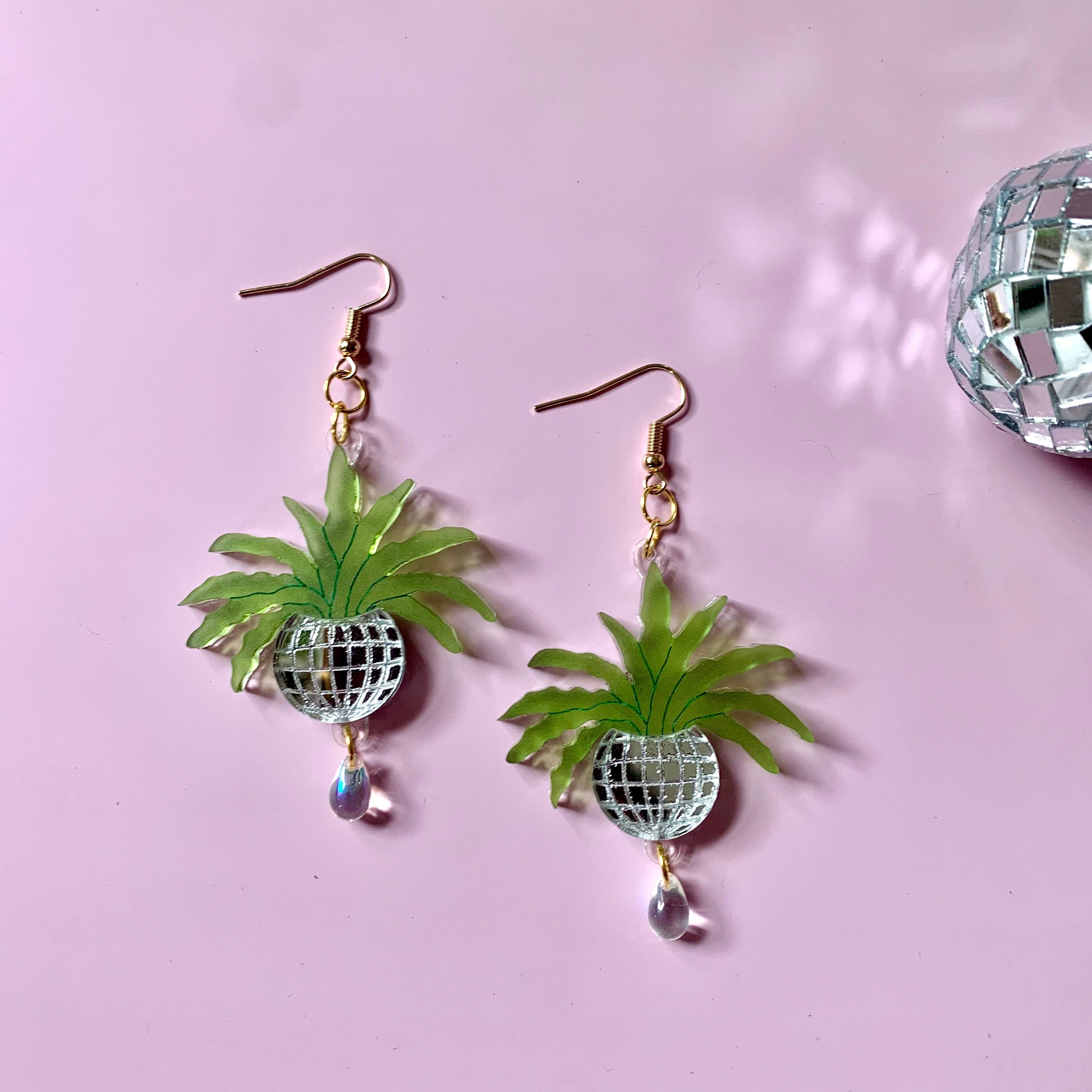 Show off your green thumb and dance skills with these dazzling disco planter earrings! Made from an original design and laser-cut acrylic. Each piece is handmade, so slight differences can be expected. These are finished with hypoallergenic, anti-tarnish gold-plated earring hooks. Earrings arrive set on a Not Picasso branded display card.* (5.5" x 4.2")