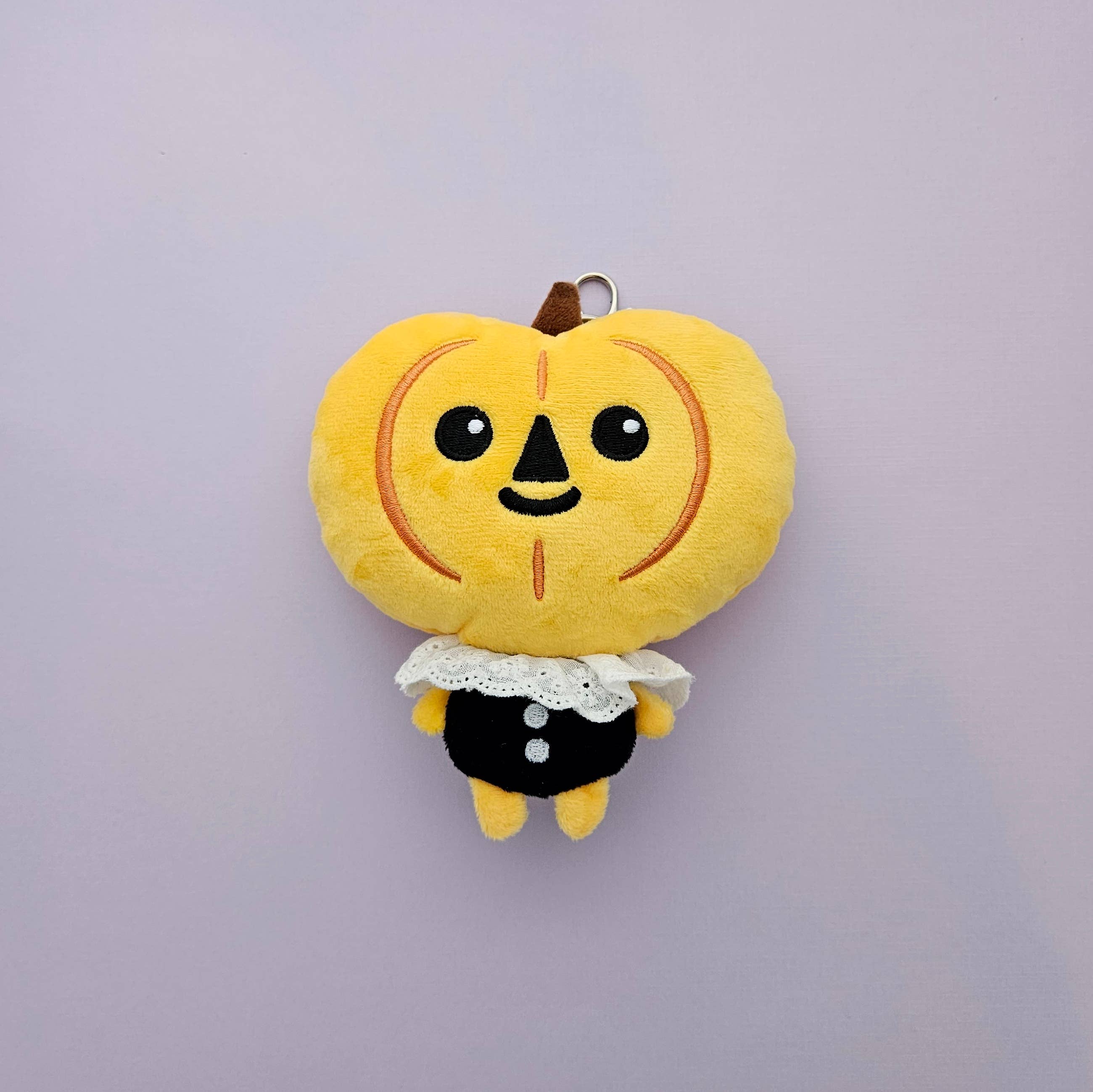 Our cheeky pumpkin boi as a plush keychain! This keychain is constructed of soft orange fabric and has a black embroidered face as well as orange embroidered lines around the face. There is a white eyelet lace collar under his head. The body has a little black outfit with embroidered white buttons and he has little stubby orange arms and legs. There's a brown stem at the top. The zippered pocket at the back is small and would fit some chapstick, folded cash, or coins. Hangs from a split keyring with clip attachments at the top.