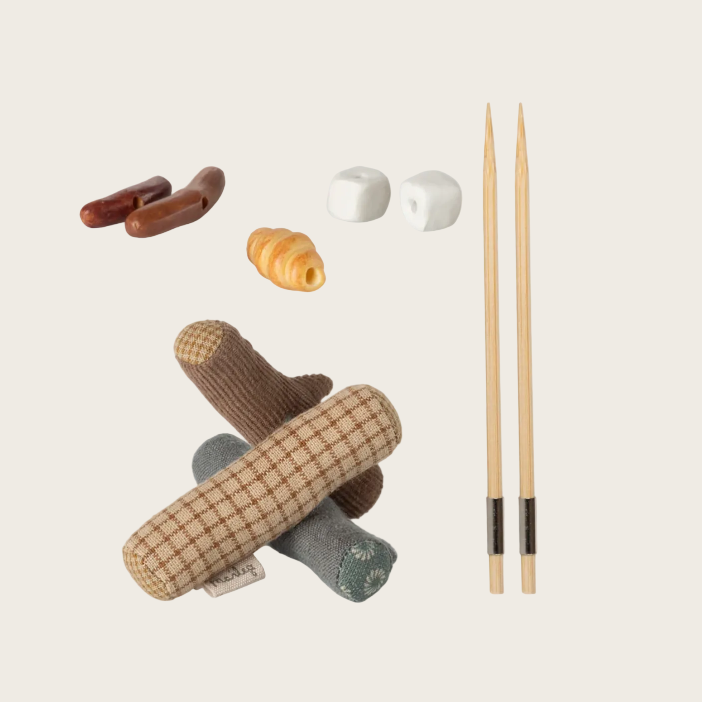 When the hiking mice are out on a trip, they love to sit by the fire and prepare their food. This set comes with sticks, food and logs. The sticks have a small metal part so the hiking mice can hold the sticks with their magnet paws.