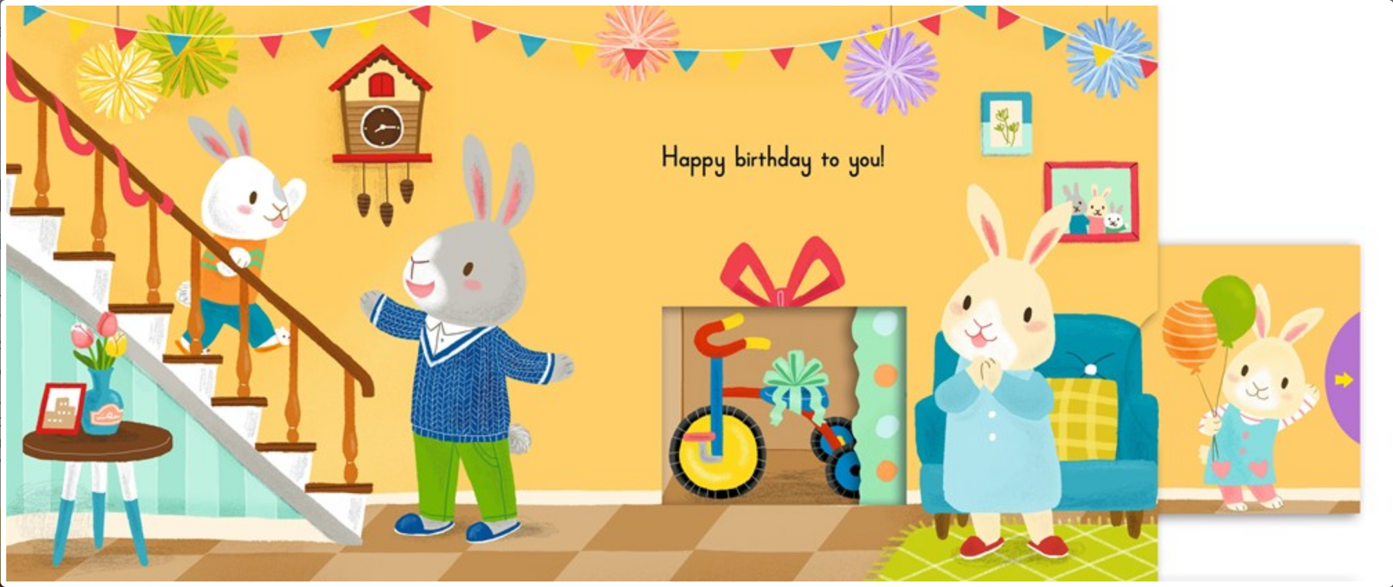 • Cartoon rabbits in a room with birthday decorations and presents.
