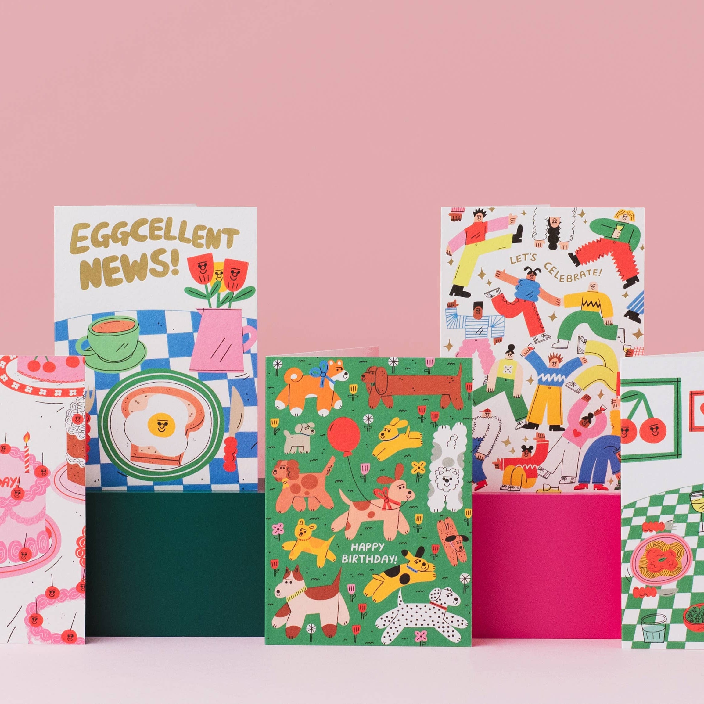 Celebrate the special day with our "Happy Birthday" dog-themed greeting card, beautifully designed by Tess Smith-Roberts. This card is a must-have for any dog lover, featuring a playful array of dogs engaged in festive activities against a vibrant green background. Each detail captures the joyful essence of a birthday party, from balloons to birthday hats, making it perfect for anyone who adores our furry friends.