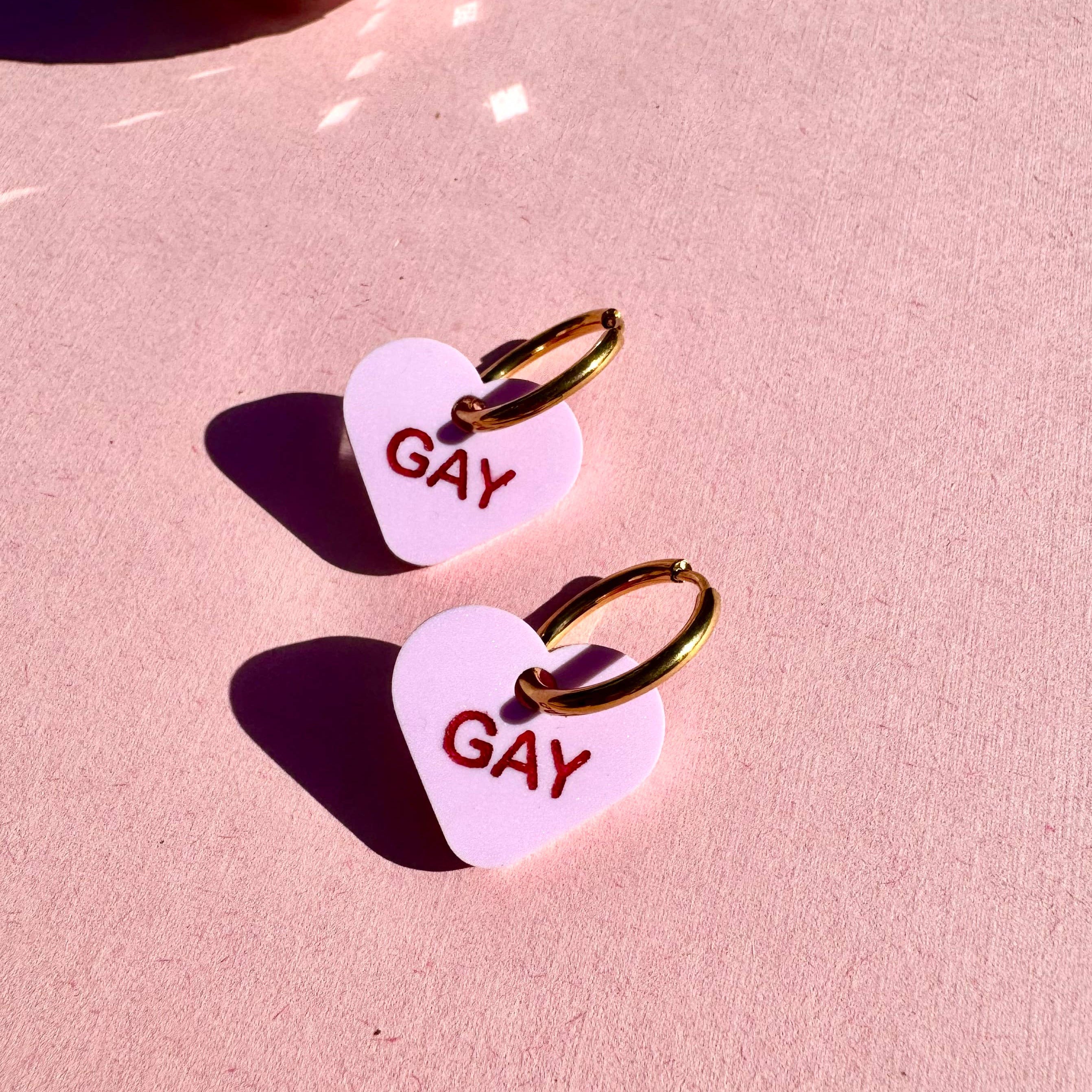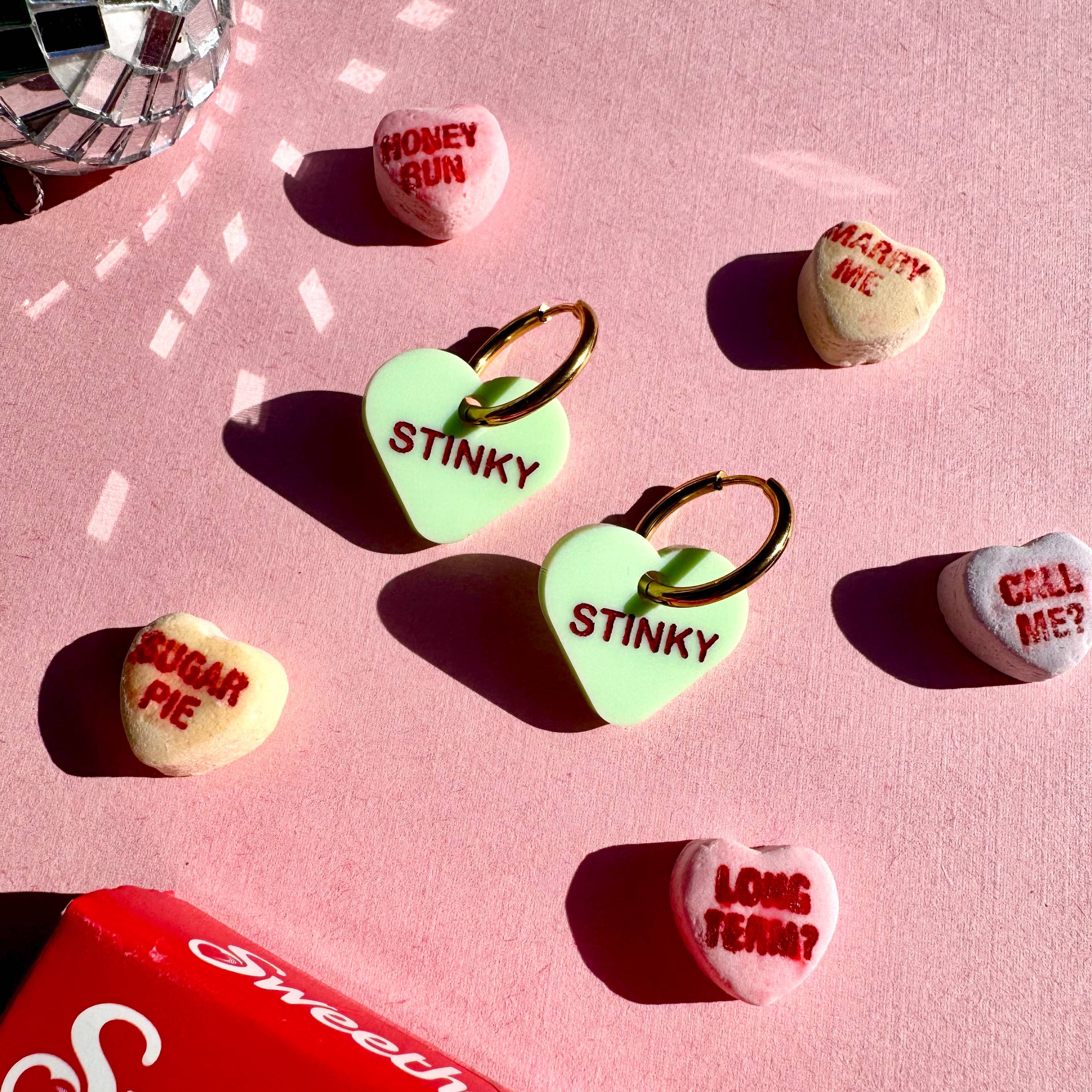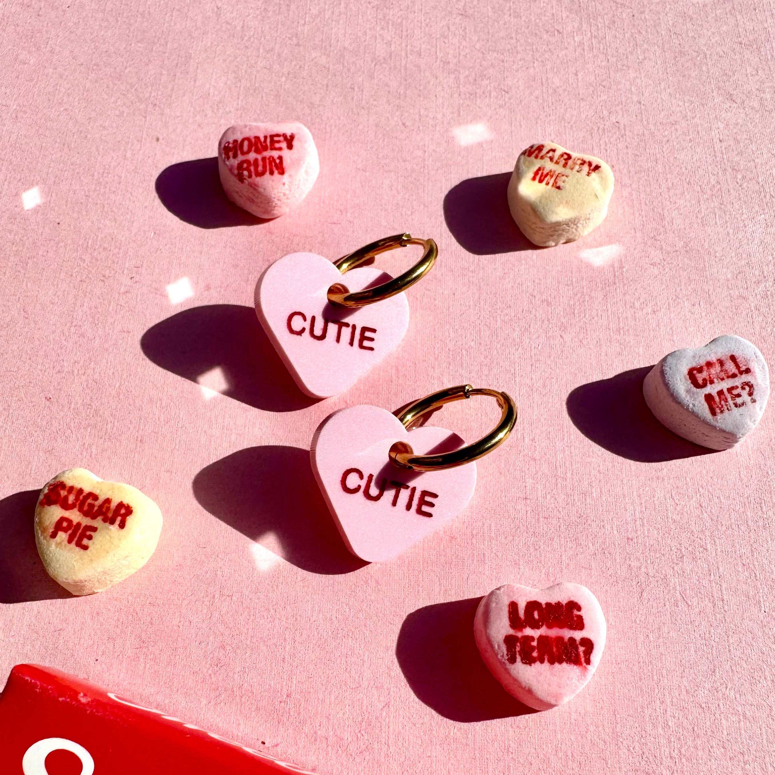 These adorable mini candy hearts are perfect for V-day! Available in 4 different fun messages. Made from an original design and laser-cut acrylic. Each piece is handmade, so slight differences can be expected. These are finished with hypoallergenic, anti-tarnish gold-plated stainless steel hoop.