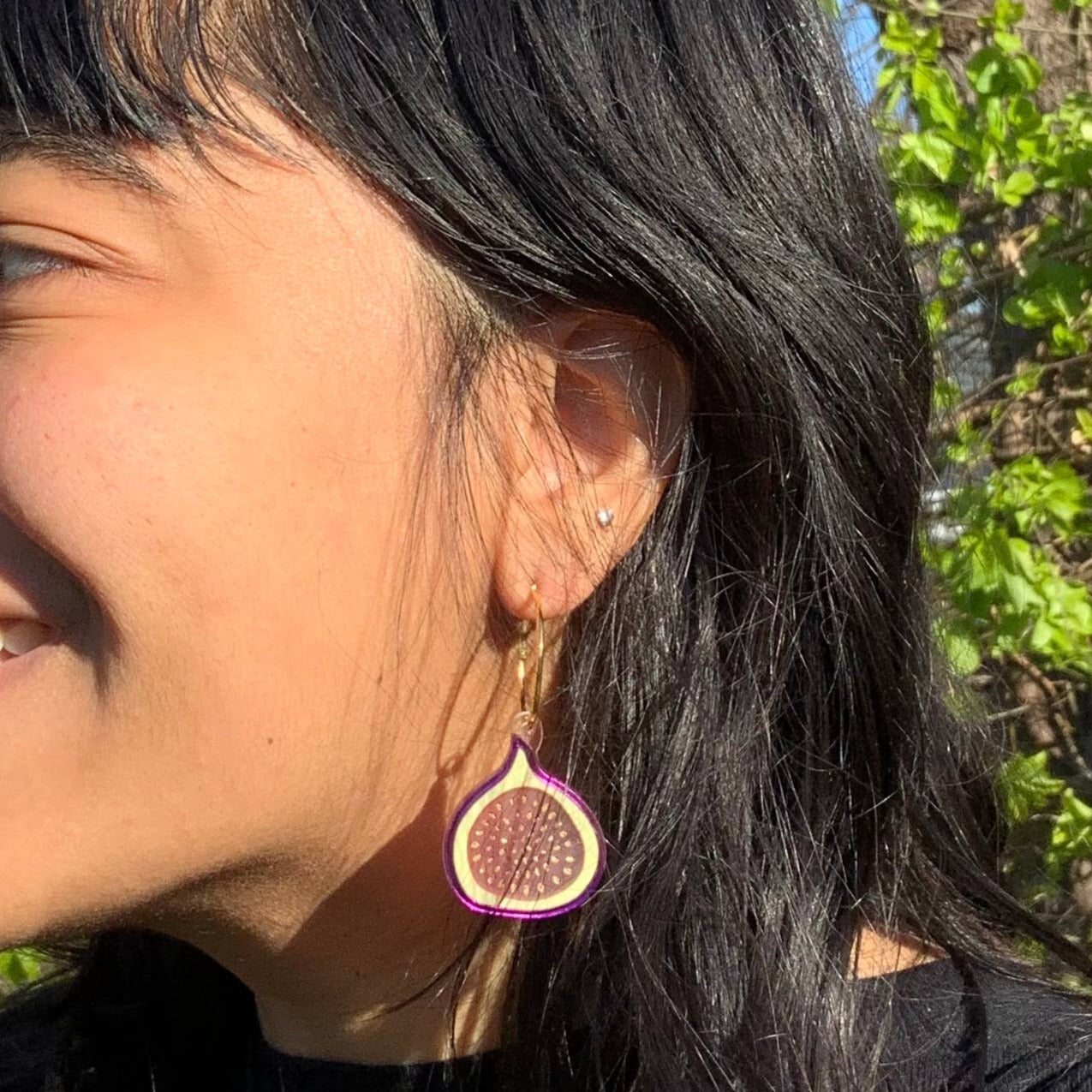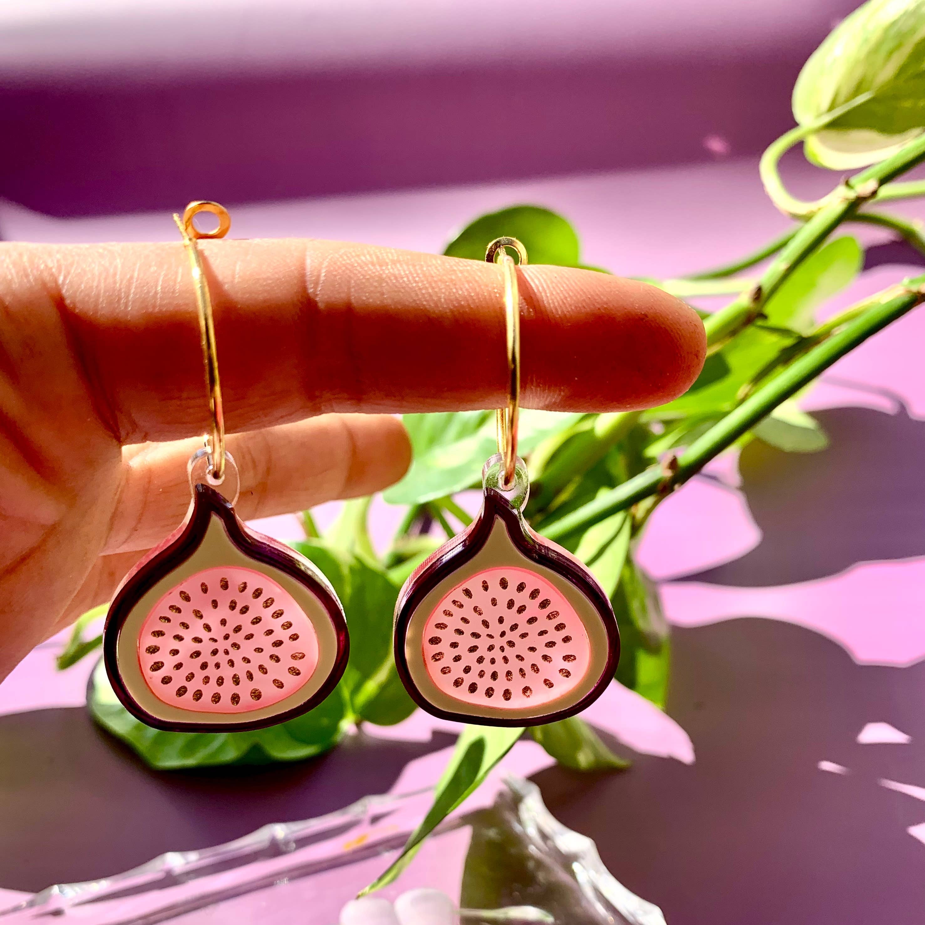 The sweetest figs for your ears! Made from an original design and laser-cut acrylic. Each piece is handmade, so slight differences can be expected. These are finished with hypoallergenic, anti-tarnish gold-plated hoops.