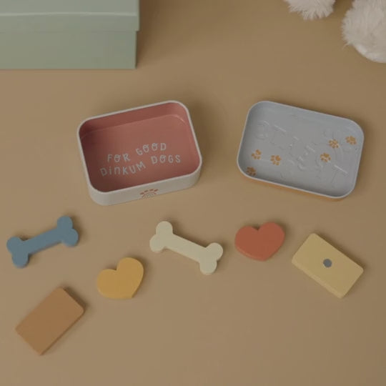 Open the gift-ready box to find a retro tin with six magnetic wooden treats, a tin food bowl, and a magnetic drumstick. Each treat is constructed with a magnetic element that allows the Dinkum Dogs to hold their favorite bone in their mouth, so they never miss a delicious surprise.
