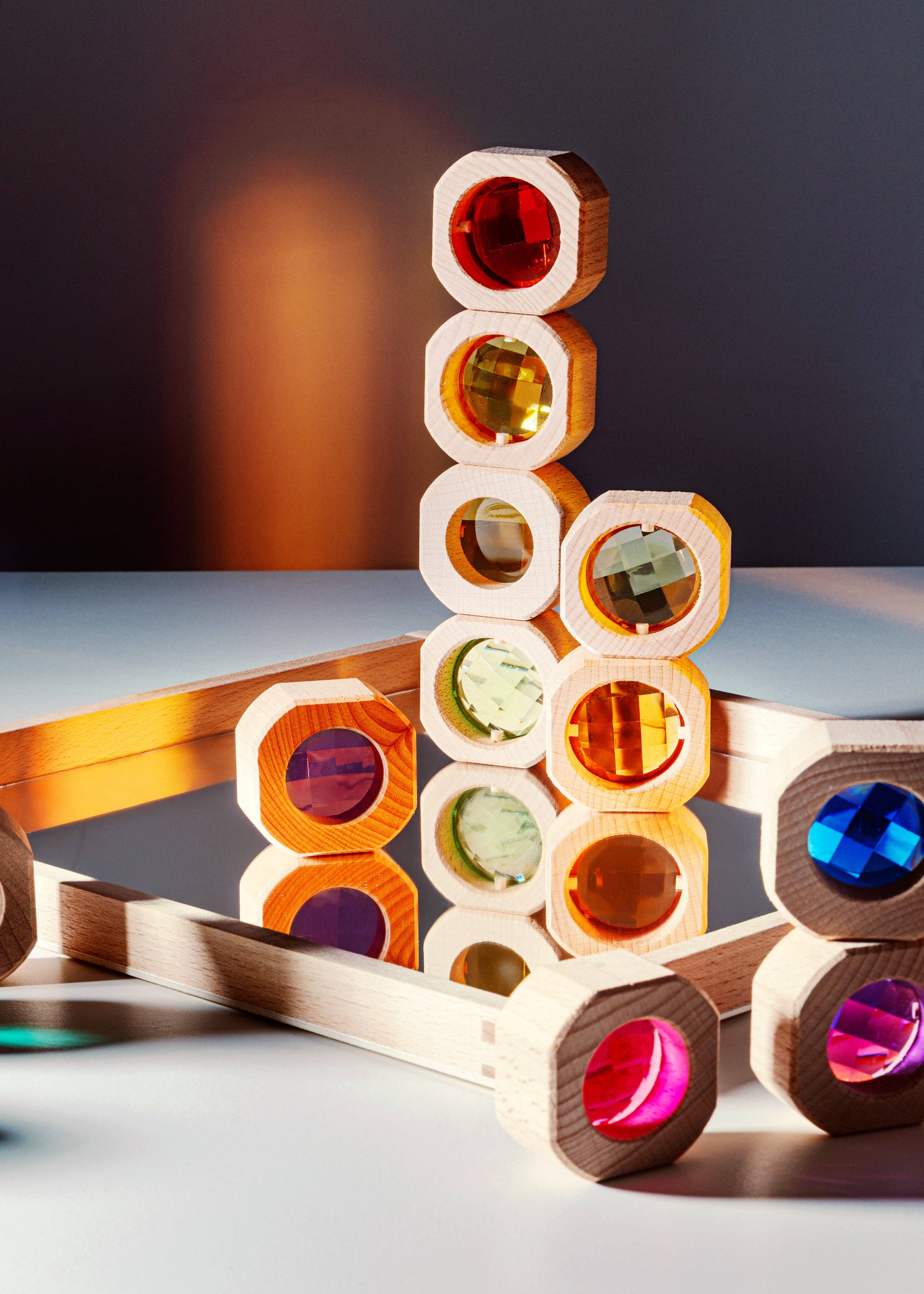 Introducing the Lottie Blocks – a set of 15 vibrant wooden blocks with acrylic windows inspired by our Lyla Block set. With the same heirloom-quality craftsmanship you know and love, the Lottie Blocks feature a more rounded wooden shape and a new variety of dazzling colors that invite children to see the world in a fresh way. Designed with smooth wooden frames and radiant faceted acrylic gems, these blocks are perfect for stacking, sorting, building, and imaginative small-world play. More than beautiful, Lottie Blocks support STEM concepts, cognitive development, and fine motor skills. Children can explore light, color mixing, and symmetry by holding them up to the sun or stacking them into towers that cast shimmering reflections. Their versatile design makes them ideal for open-ended play, loose parts play, and creative storytelling. Whether you’re adding them to your Lyla set for even more variety, or starting fresh with Lottie, these blocks are a stunning addition to any modern playroom.