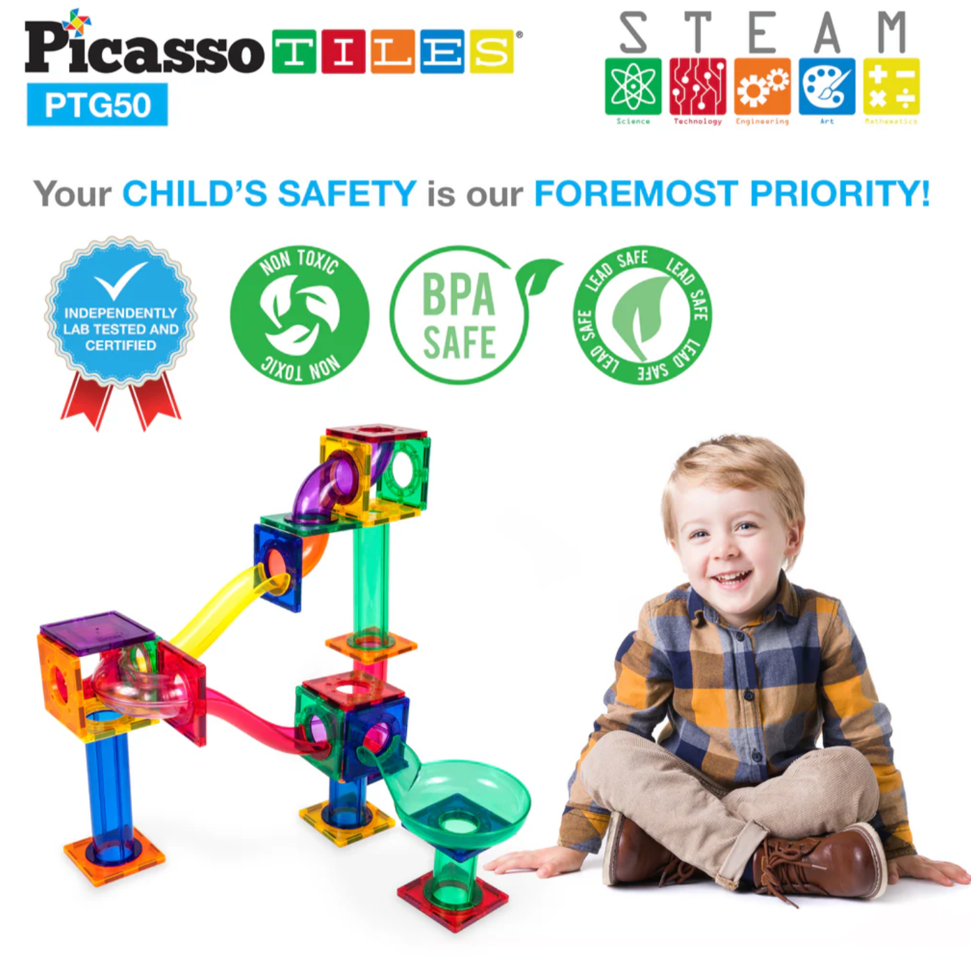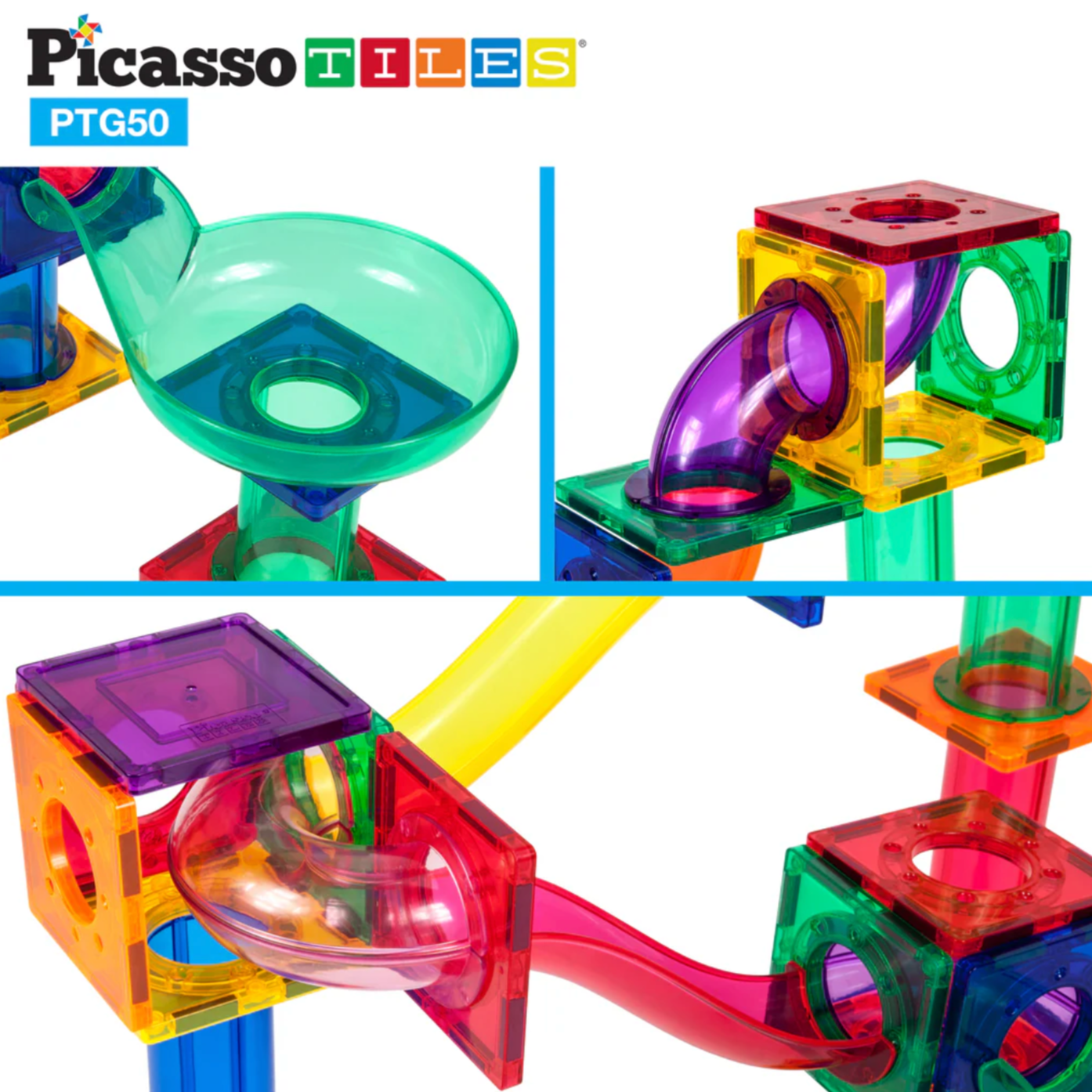 OPEN-ENDED POSSIBILITIES - Contains vibrant, colorful, and translucent magnetic piece building blocks and tiles that connect intuitively to allow frustration-free playtime, hand-eye coordination, motor skill training, and child brain development. Equipped with different geometric shapes, including columns, slopes, slides, funnels, U-turns, and steel-weighted marbles, the 3-D race track allows multi-layer designs that enable children to stimulate their imagination. PicassoTiles Marble Run Piece Magnetic Tile Race Track Toy Play Set