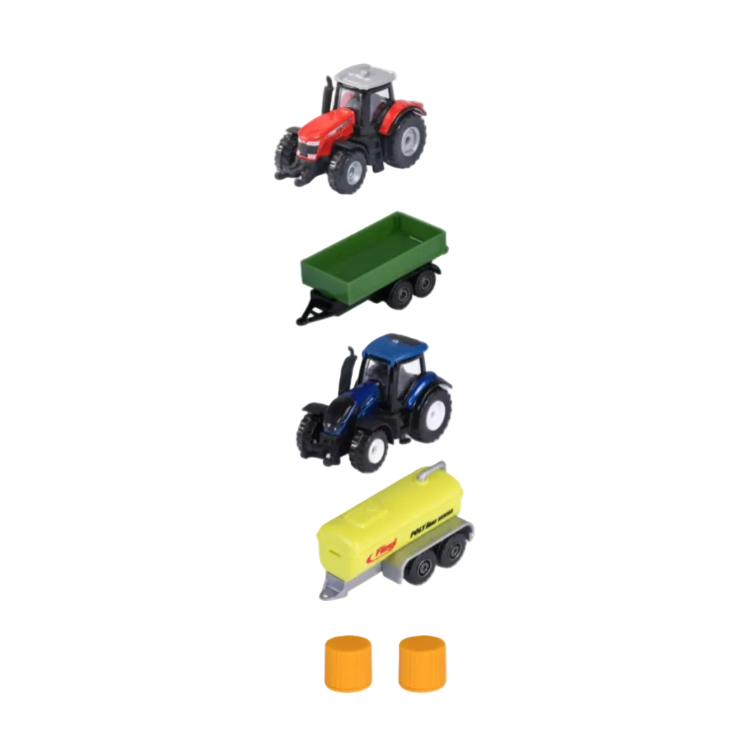 • Collection of toy farm vehicles including tractors and trailers on a white background