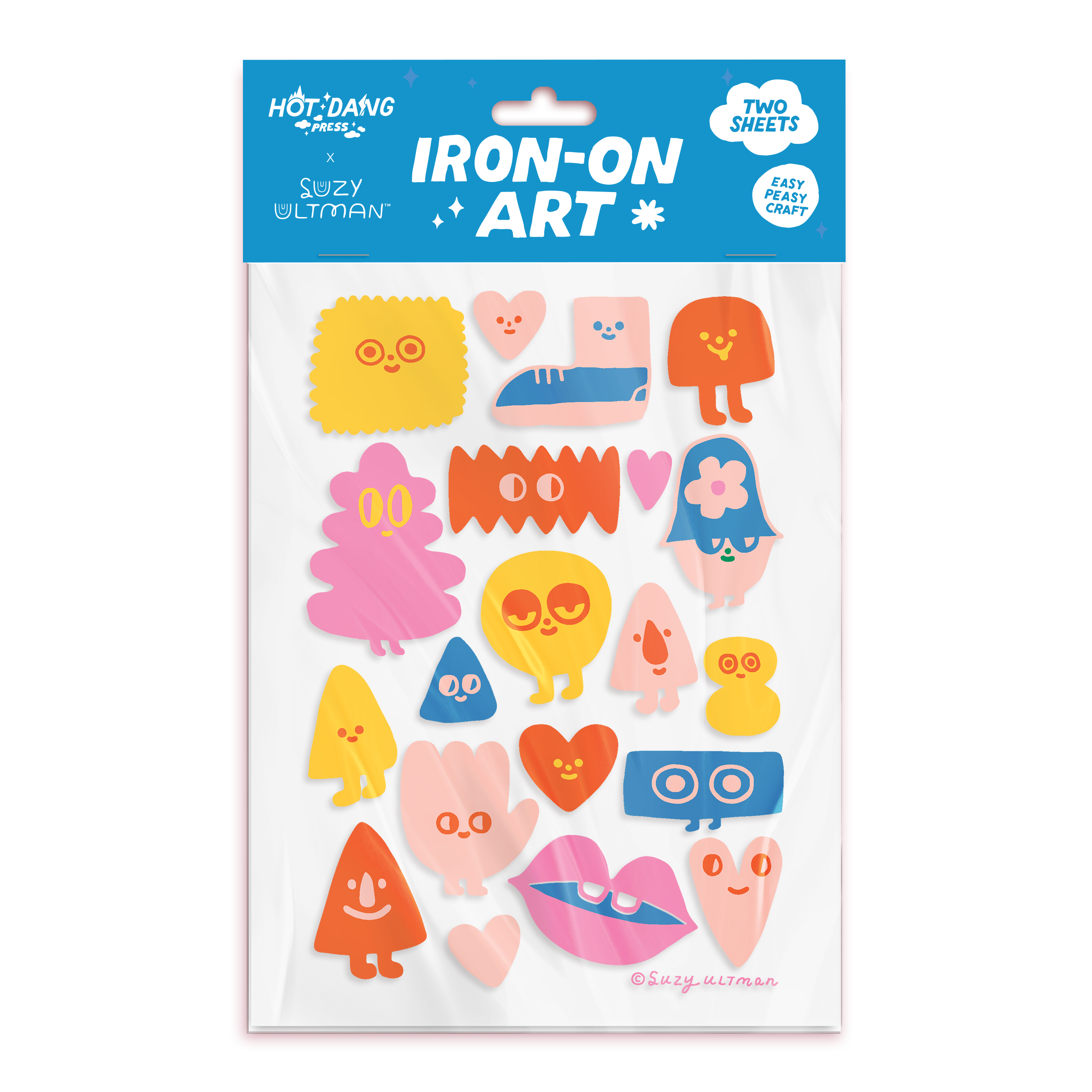 Hot Dang Press announces the Spread Love collection in collaboration with Suzy Ultman. These Lovies are launching with Valentine's Day in mind, but their charm goes far beyond a fleeting holiday. Suzy Ultman celebrates creativity, connection, and community through her personal philosophy, Make Time for Play. This outlook informs her art, books, and signature products which inspire and delight young and old alike. Iron-on art to customize and enhance your apparel, totes, hats, tea towels, bandanas, handkerchiefs, leather goods, and other treasures. Each set includes two sheets of the displayed illustrations, heat protective parchment paper for application, and easy peasy instructions. You bring the heat! All you need is an iron.