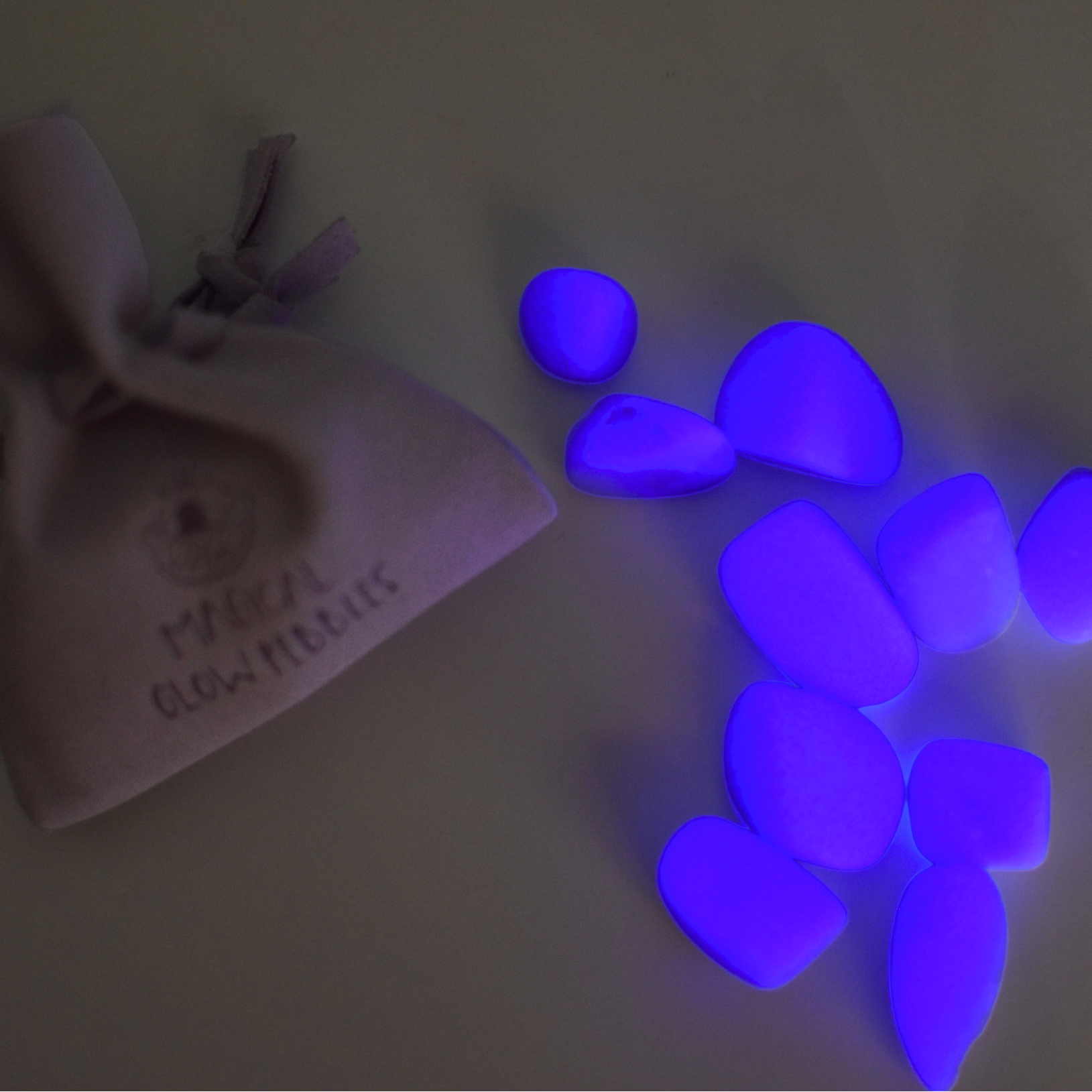 These magical pebbles store light and glow with a soft, gentle purple shimmer—no batteries needed! Made with a special resin blend, they look and feel like real pebbles but are waterproof, drop-resistant, and non-toxic. For best results, charge in direct sunlight for 8 minutes or under a UV/black light for faster activation. (Indoor lamp light will not charge these stones.) Crafted with premium strontium aluminate, the brightest and longest-lasting glow material available. Unlike cheaper zinc sulfide, these pebbles shine longer, more evenly, and last for 15+ years. The purple glow is softer and more calming than traditional green glow stones—perfect for gentle magic, bedtime rituals, and quiet moments. ✨ Calming Night Glow – A soft purple light for peaceful sleep ✨ Magic for Forts & Play – Adds a dreamy glow to imaginative worlds ✨ Calm Corner Companion – A gentle light for reading, resting, or big feelings ✨ Fairy Paths & Secret Trails – Create glowing paths for fairies, dragons, or tiny creatures.