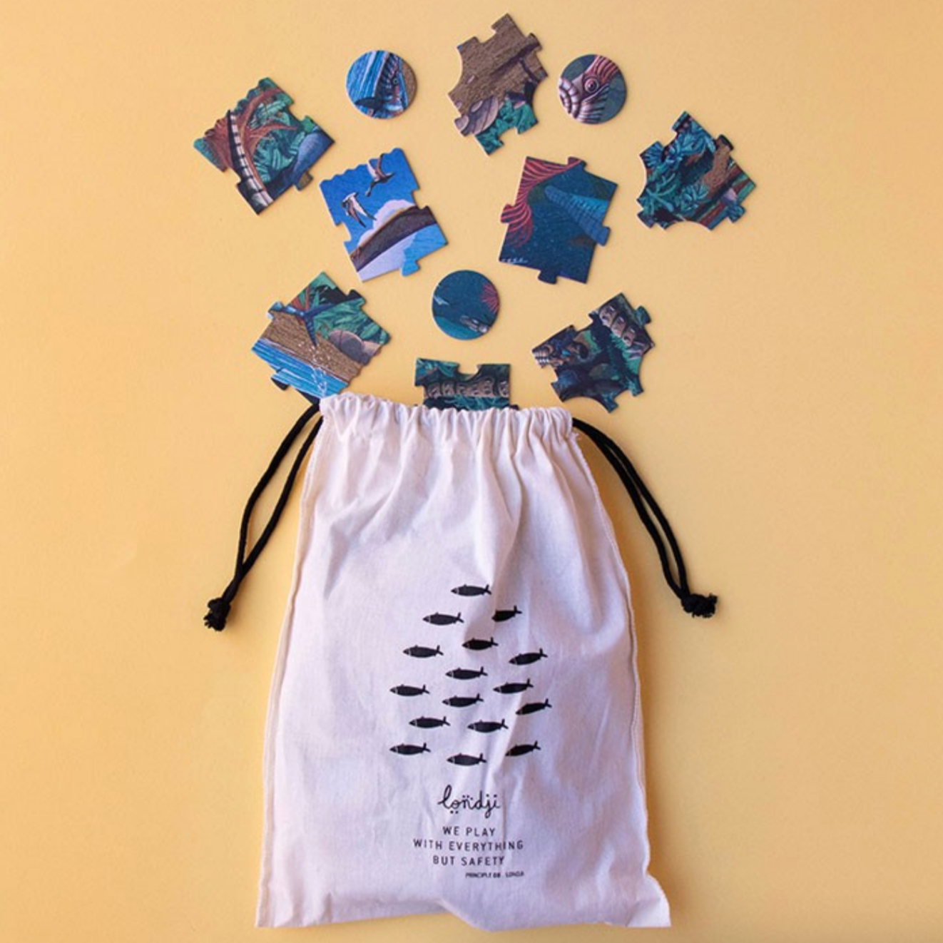 • Jigsaw puzzle with a prehistoric sea creature design on a beige background