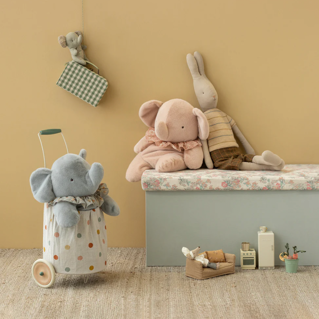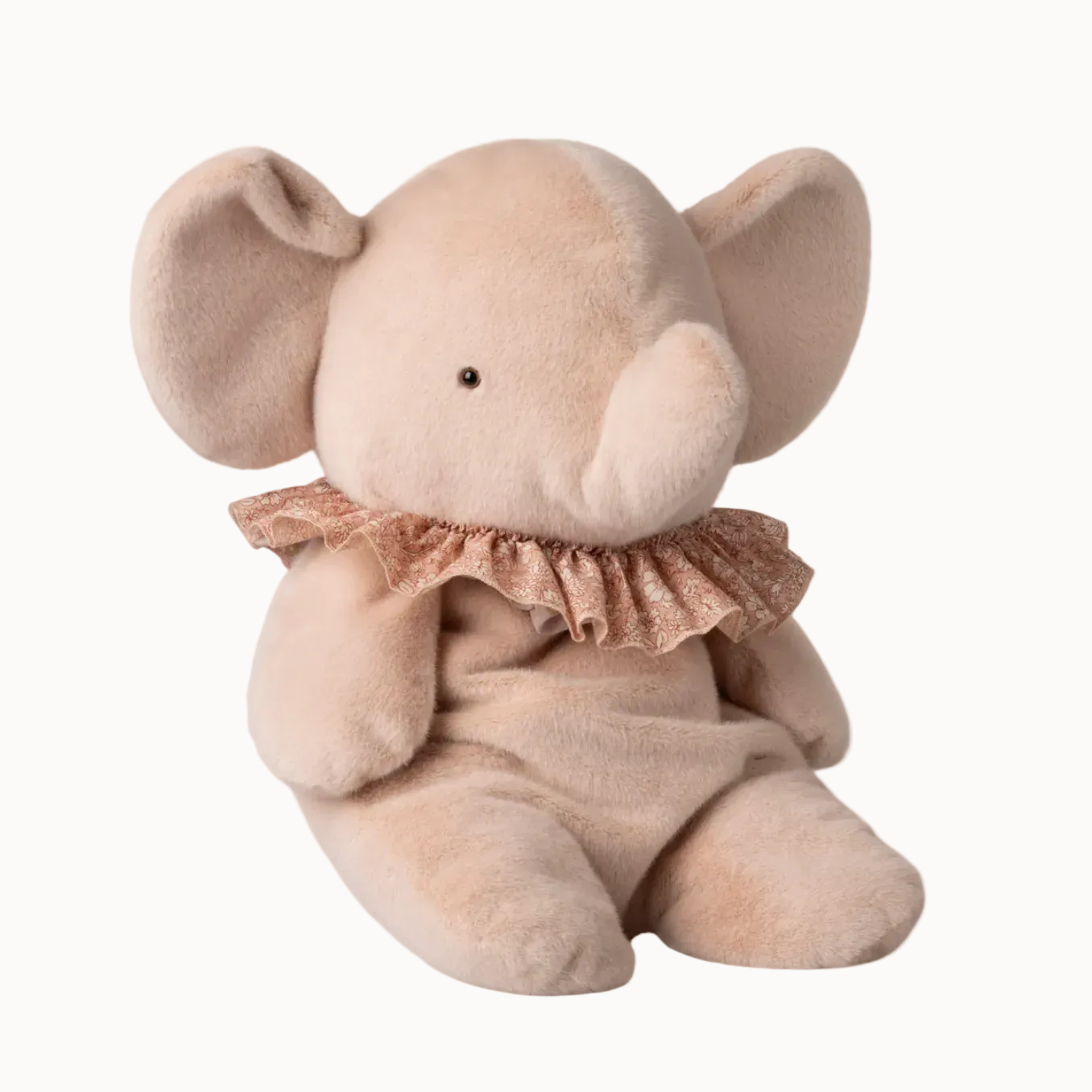This elephant is made in the softest plush which gives a lovely hand feel and the warmest hugs. It can sit by itself as it has beans in the bottom.