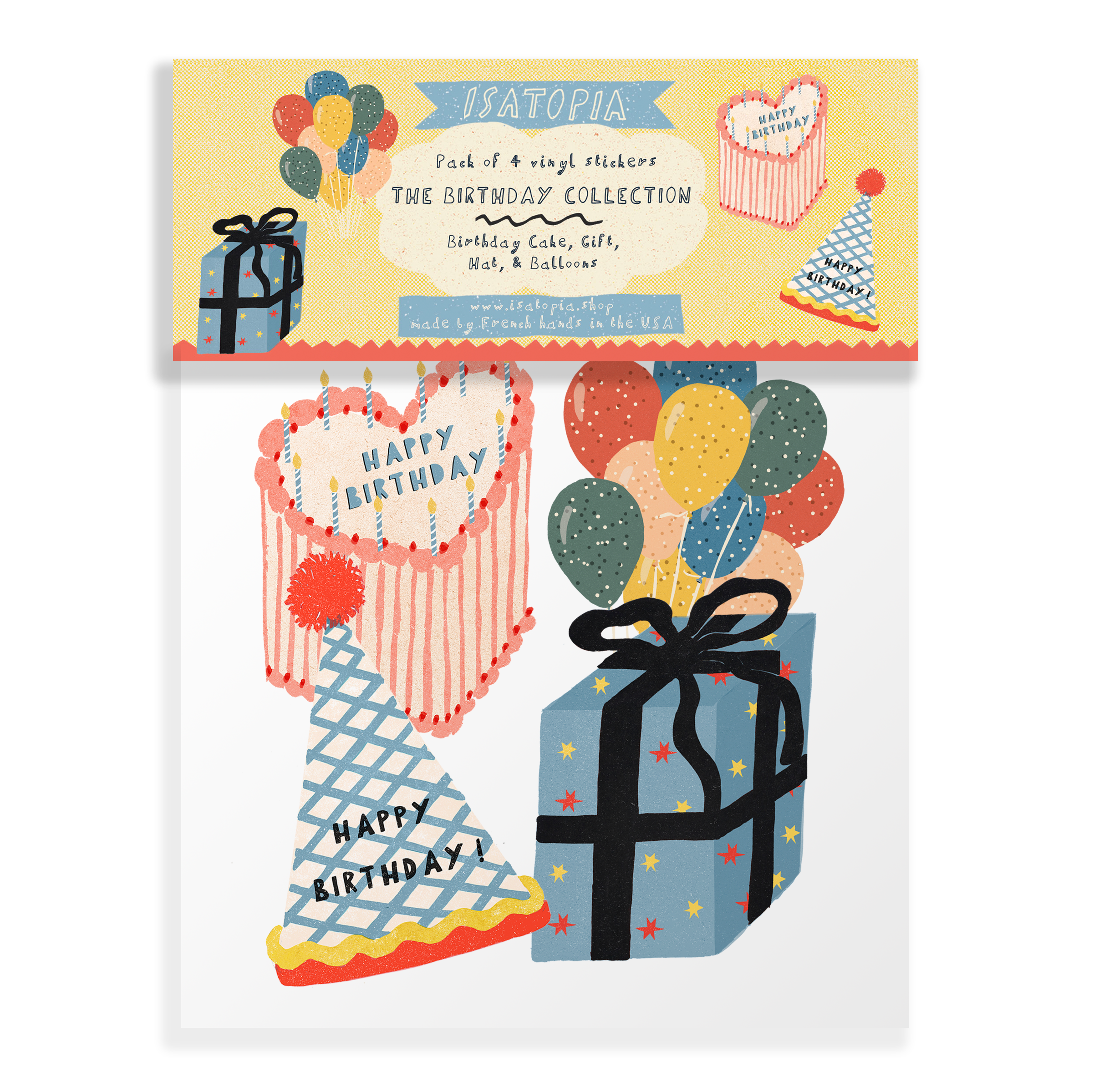 A pack of stickers to celebrate Birthdays! Featuring 4 vinyl stickers, a gift, a birthday hat, a birthday cake and balloons! Perfect to add a touch to a birthday gift, or decorate for a special birthday party! The design comes from original gouache illustrations made by Isabelle.