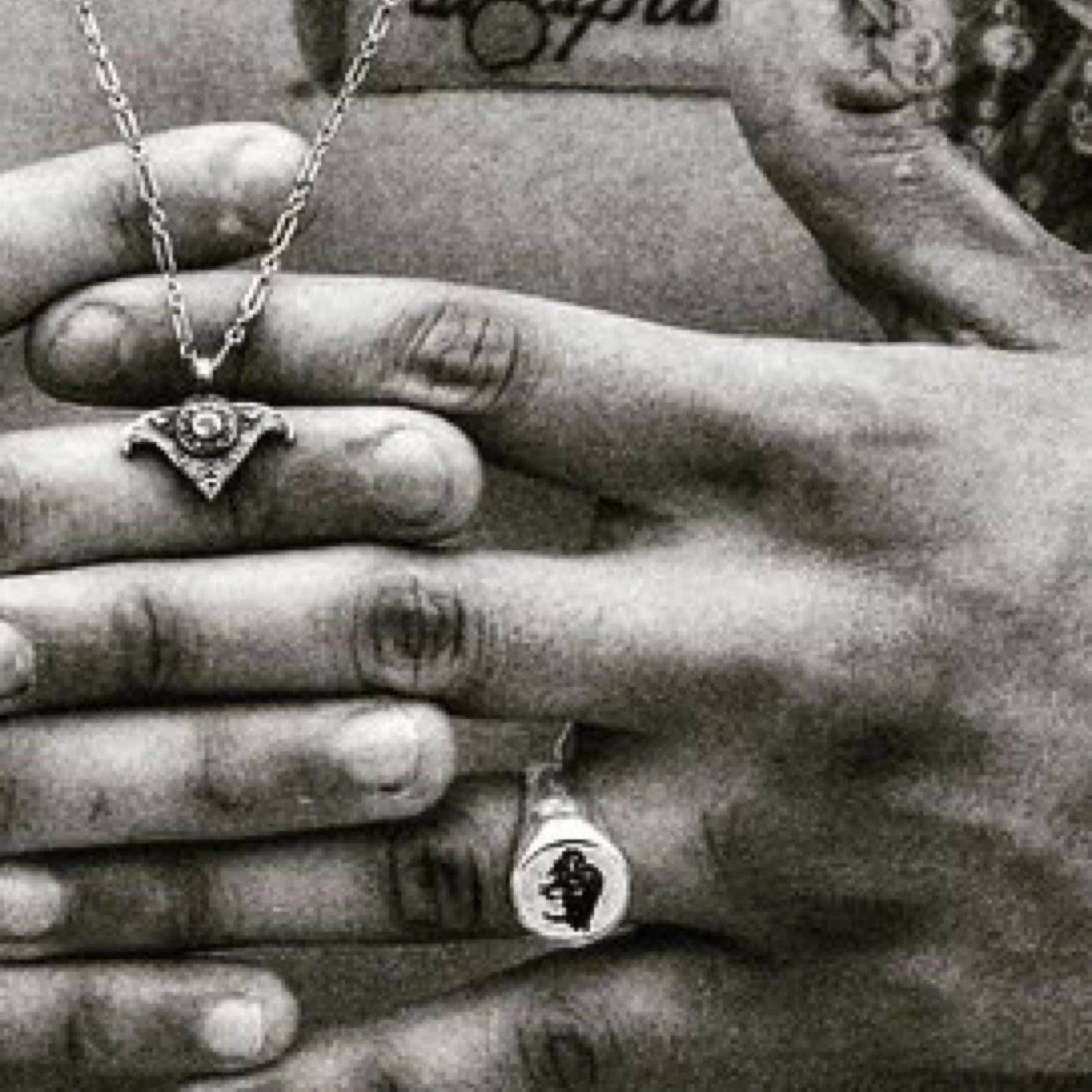 • Close-up of hands wearing necklaces and rings with a blurred background