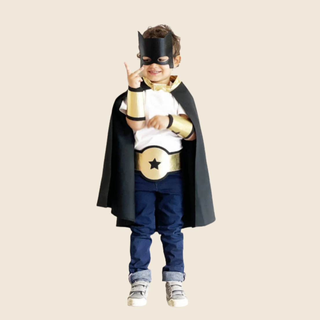 The new black and gold superhero kit includes: 1 black cloak with gold star + 2 gold cuffs with black star + 1 gold belt with black star + 1 mask.
