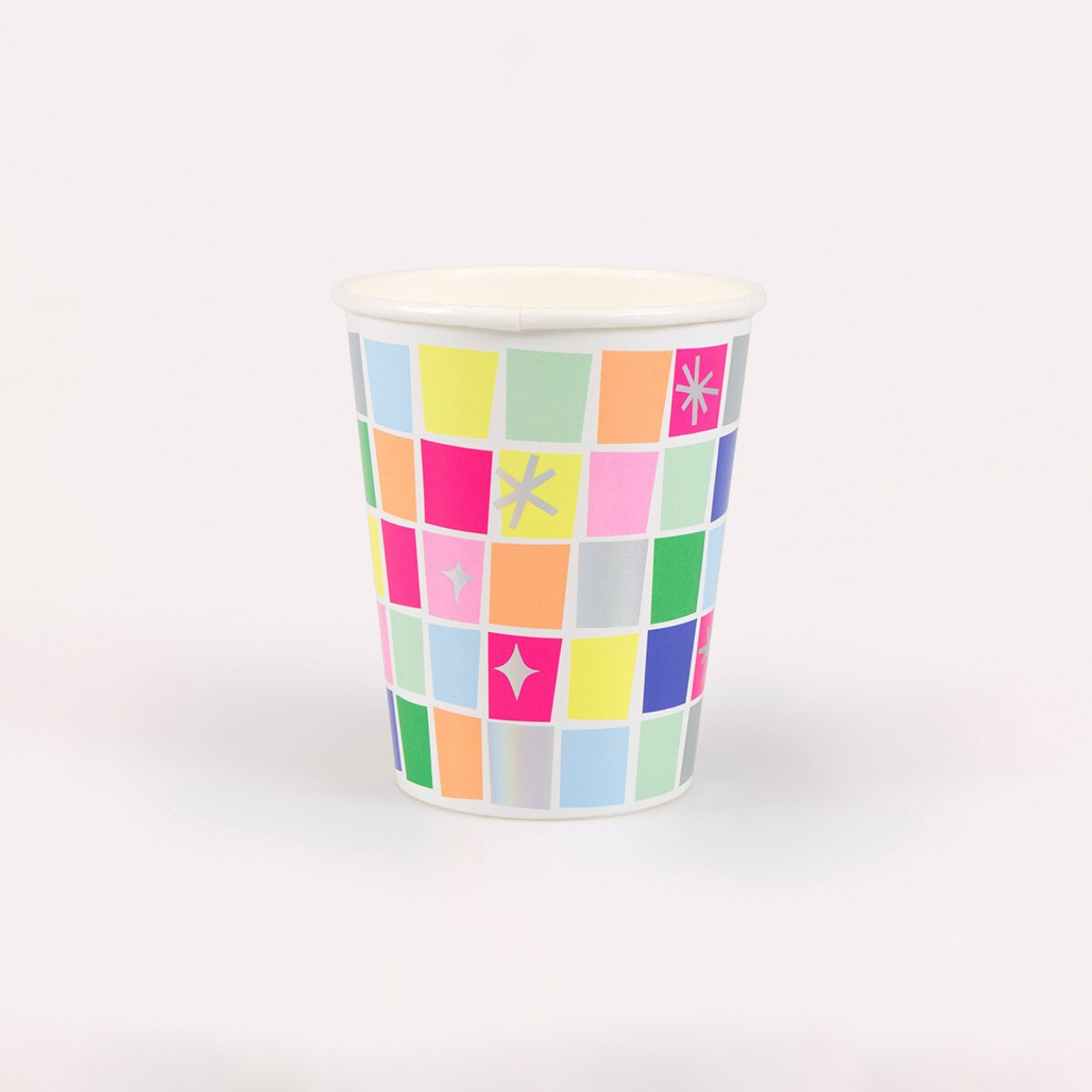 • Colorful paper cup with a pattern of squares and stars on a white background
