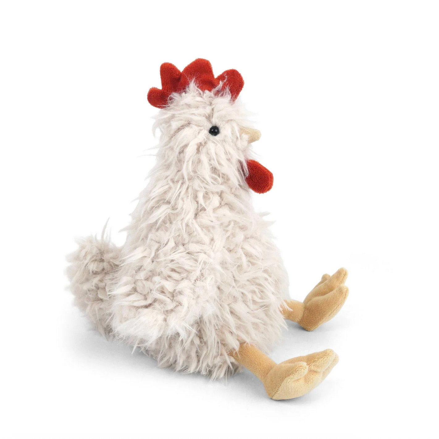 Mon Ami's Shaggy Chicken, the fluffiest feathered friend on the farm! With it's tousled, cream-colored "plumage" that looks like it's been styled by the wind, it's a little bit scruffy but a whole lot charming. Her bright red comb and wattle add a pop of barnyard flair, while her golden beak and oversized, floppy feet give her a delightfully quirky look. She sits perched and proud, ready to cluck her way into cuddle time. Whether she's ruling the roost or just lounging around, our shaggy chicken is all about cozy snuggles and a touch of silly farmyard fun