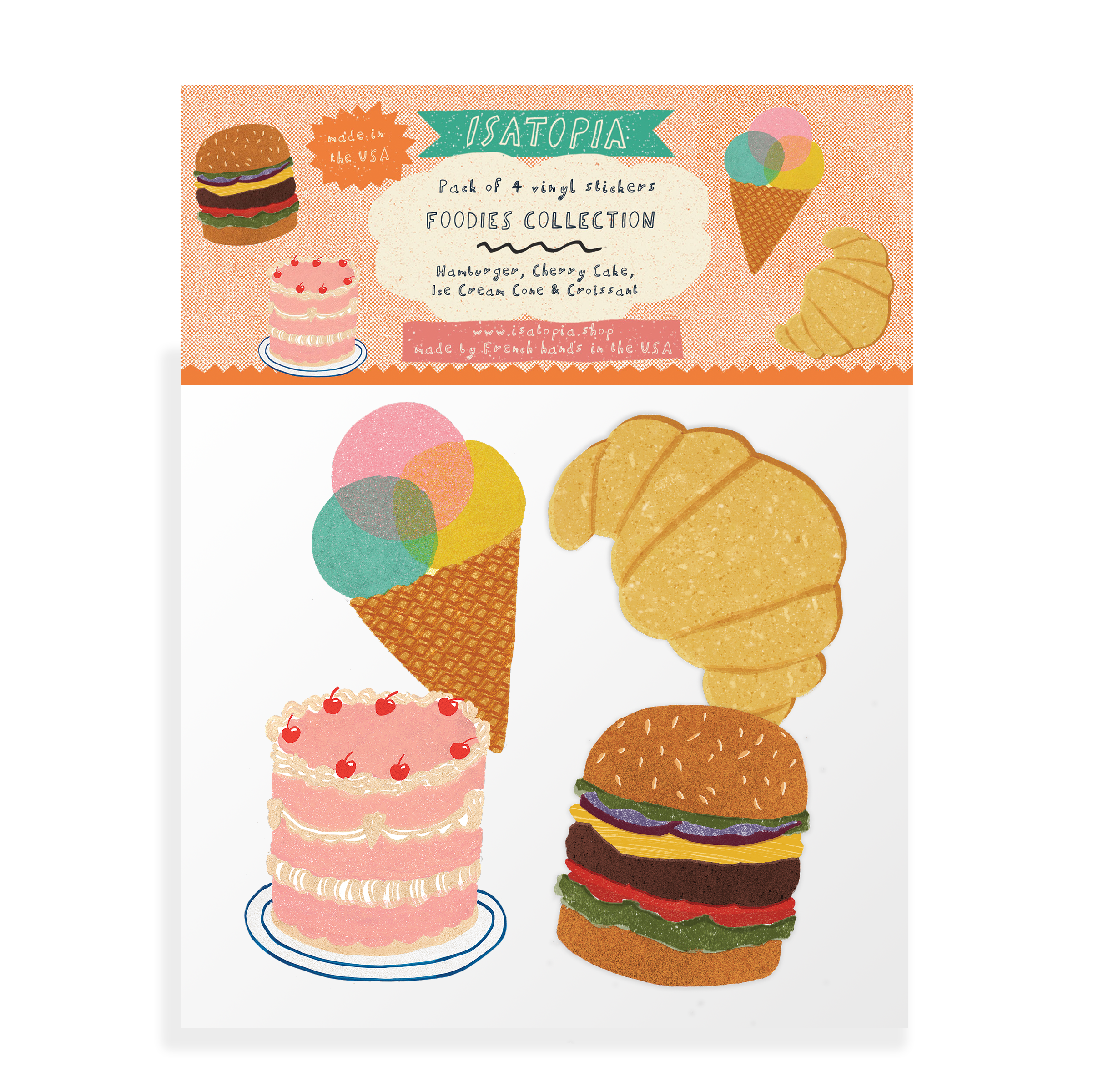 The Foodies sticker pack featuring he Hamburger, the Croissant, the Party Cake and the Ice Cream Cone - the yummiest sticker selection! Perfect for decorating notebooks, party bags, lunchboxes, or little love notes, these stickers bring the charm and mischief of the Wild Bunch to everyday fun The designs come from original illustrations made by Isabelle.