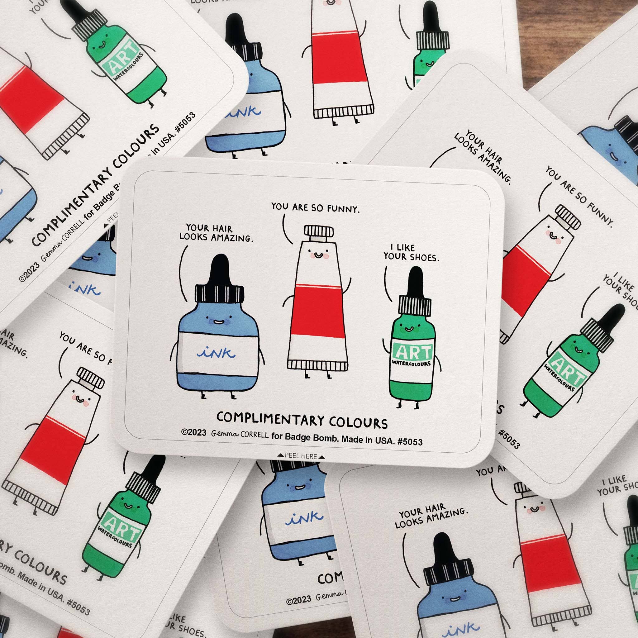Prepare to be showered with compliments by our fabulous Complimentary Colours sticker illustrated by Gemma Correll. Stick it on your notebook, art supplies, or anywhere you need a daily dose of ego-boosting hues. With this sticker by your side, you'll always have a cheering section to provide a colorful pick-me-up.