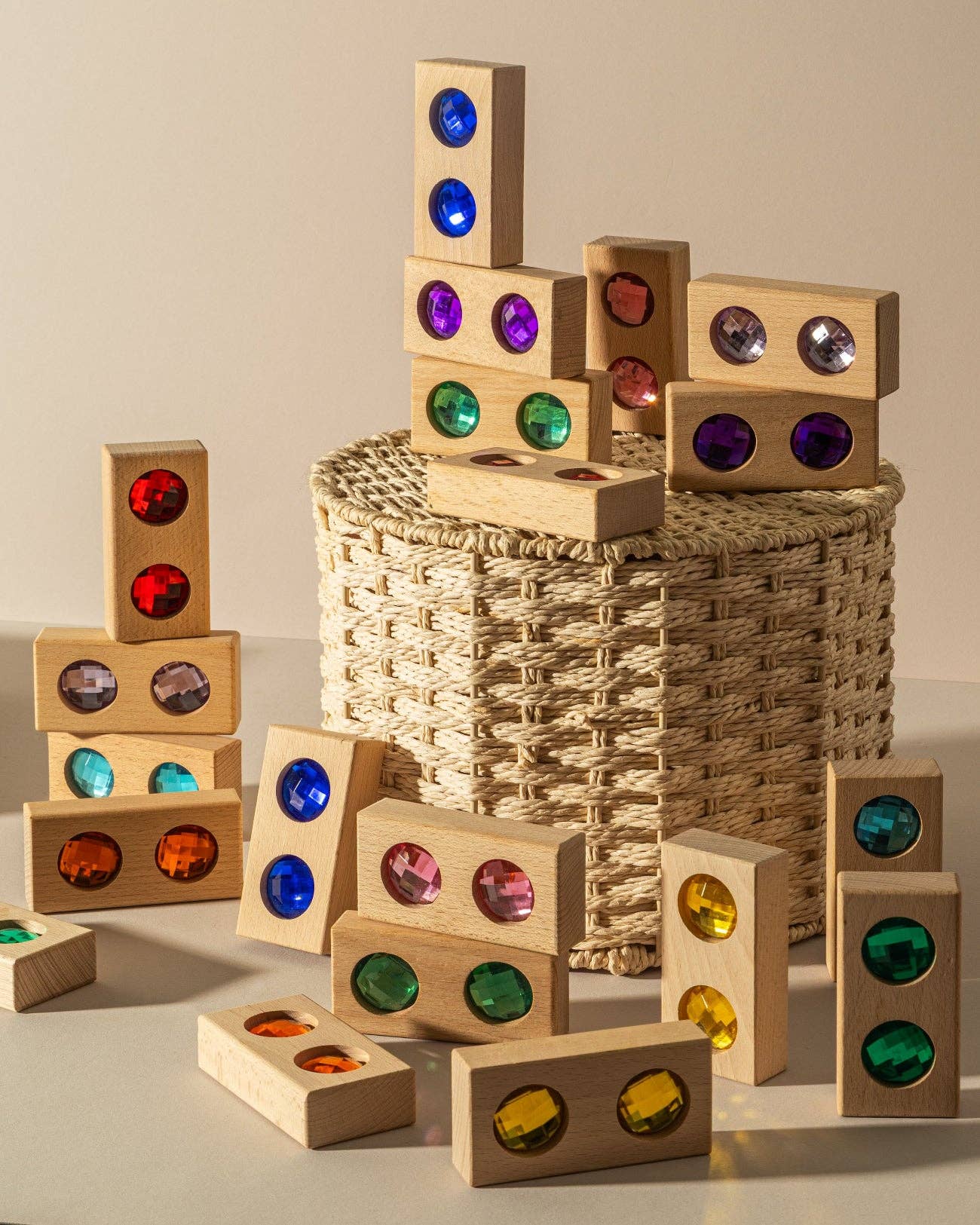 Crafted from sustainably sourced beechwood and embedded with fancy lucite “gems” in a rainbow of hues, our Hero Blocks captivate young minds while encouraging hands-on, open-ended play. Their smooth finish and tactile appeal make them perfect for sensory exploration, color recognition, stacking, sorting, and light play.