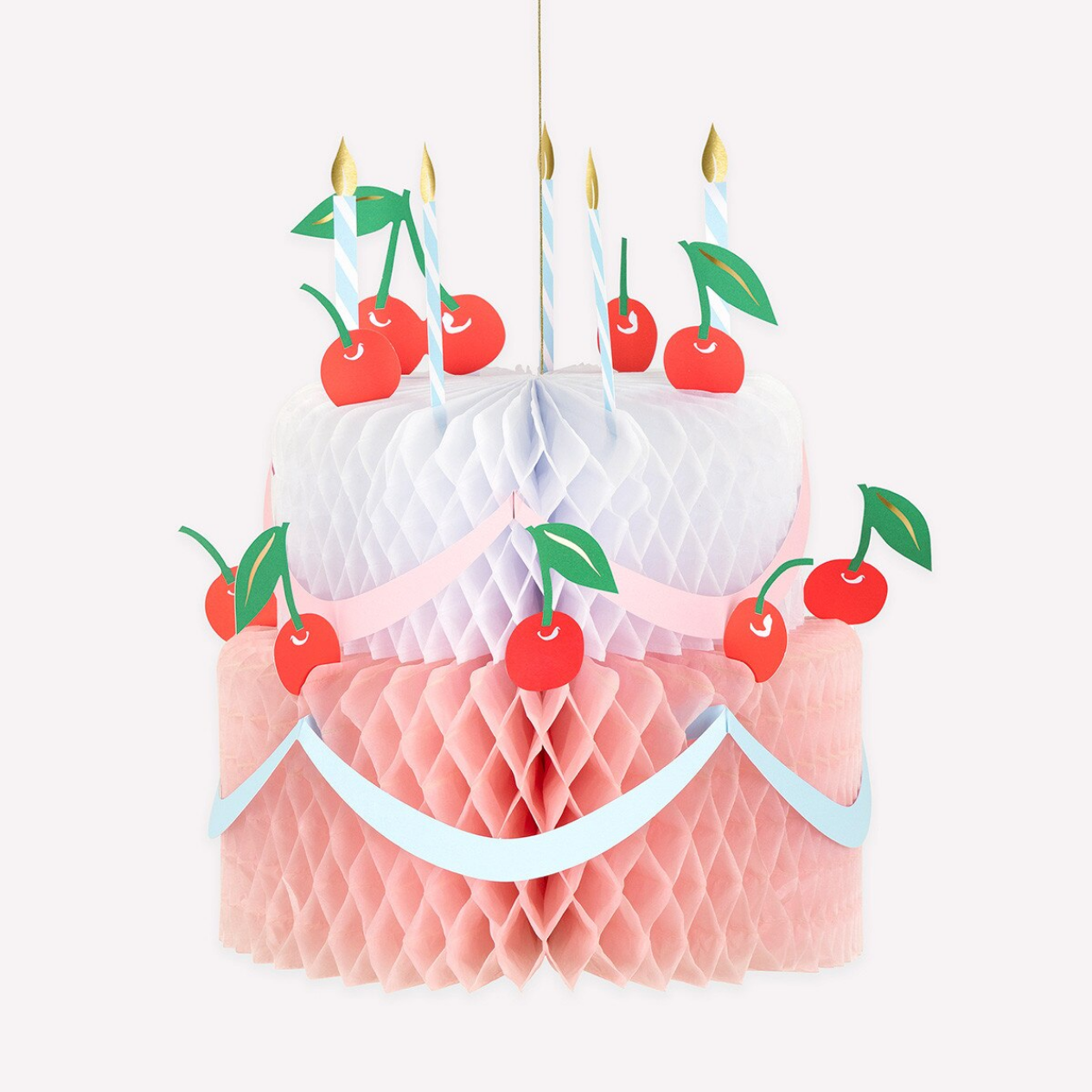 Nothing says 'Happy Birthday' like a big, beautiful cake – real or paper! If you're not a baker, or simply want a decorative option alongside your party treats, our honeycomb birthday cake decoration is a must. Peach pink and white honeycomb combine beautifully with paper cherries, birthday candles and swags. Hang it wherever you want a stunning party centerpiece. Best of all, it can be packed away and brought out year after year for endless birthday celebrations.