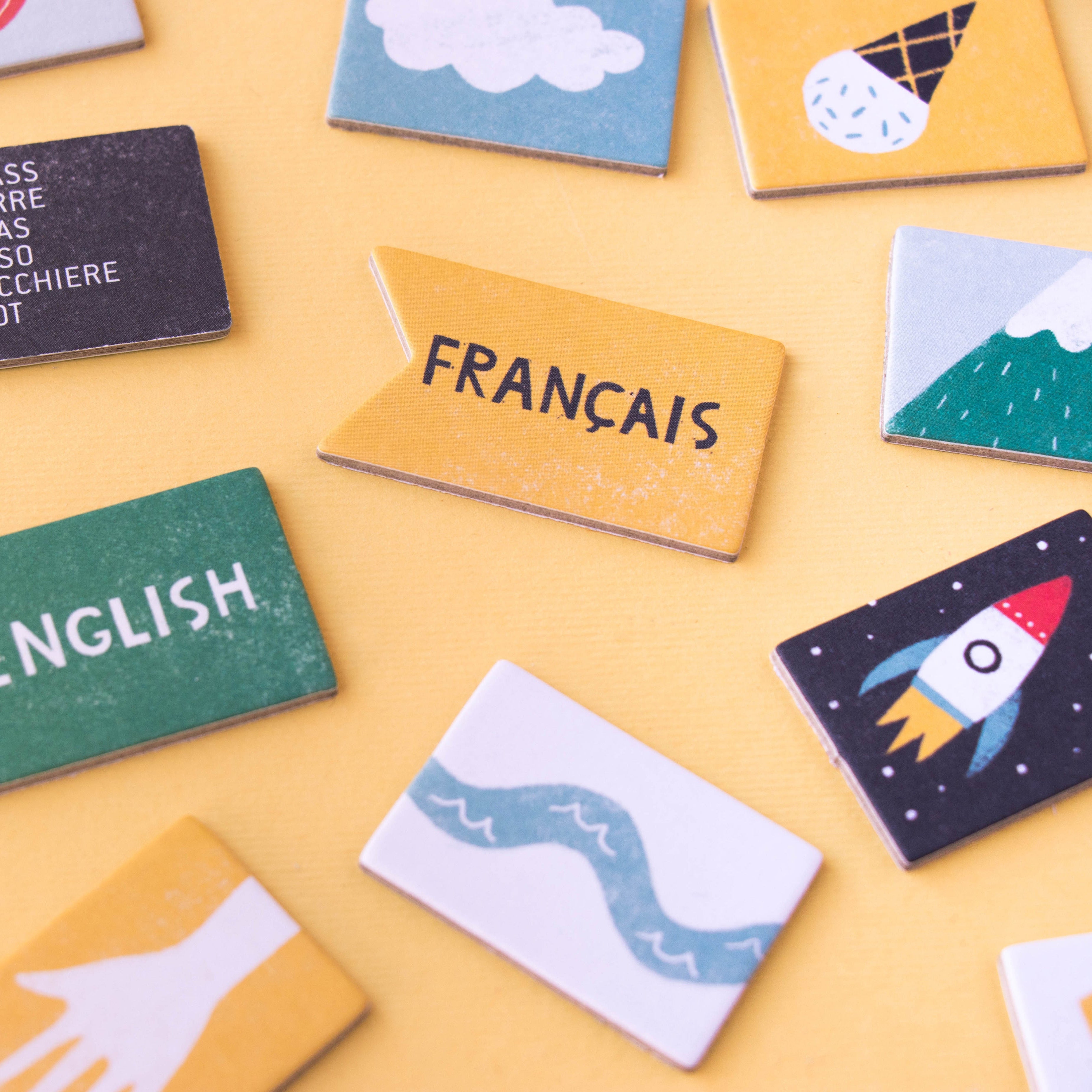 Learn vocabulary in different languages using the illustrated cards in this word game. The best way to learn other languages! A family game.