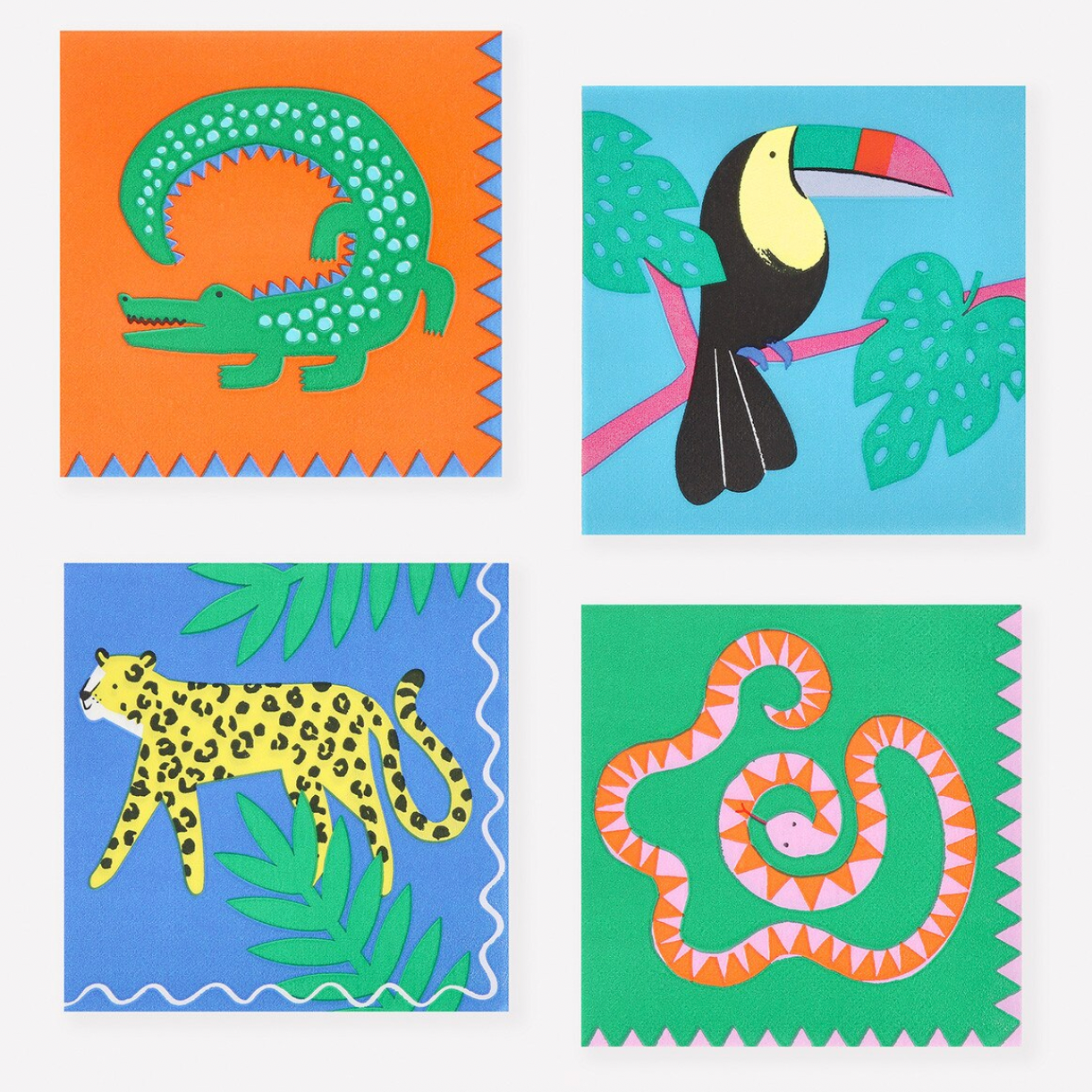 • 16 Paper napkins in 4 x 4 designs of a snake, jaguar, toucan and crocodile