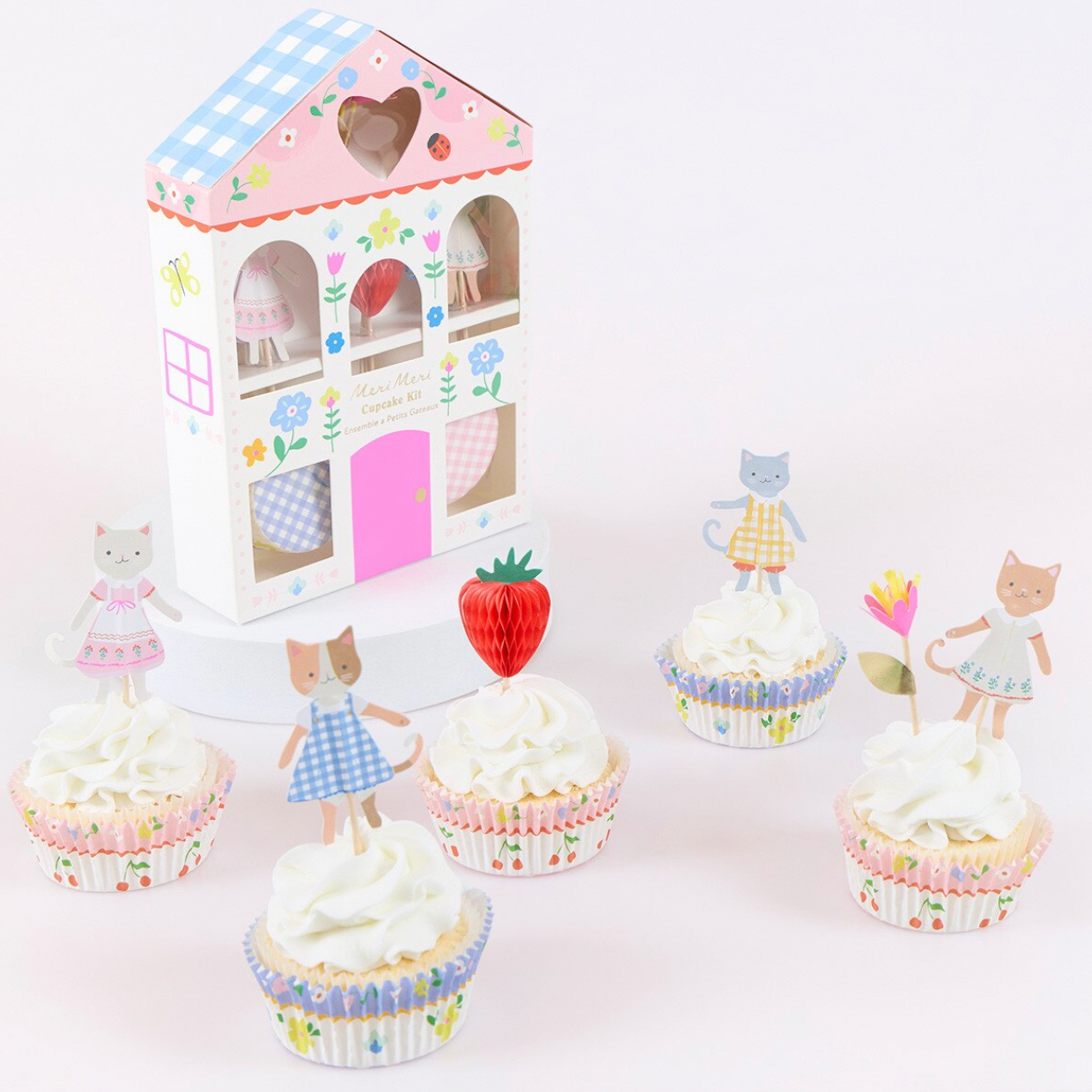 Bring the whimsical sophistication of the folk interior trend to children's parties with this Kitten Club cupcake kit. Nestled inside a charming cottage-shaped box, it includes 24 cupcake cases in pink and blue gingham and 24 toppers featuring adorable kittens in folk-inspired costumes, embellished flowers, and honeycomb strawberries. Perfect for little bakers, it transforms every cupcake into a storybook creation, adding a playful enchantment to the party table.