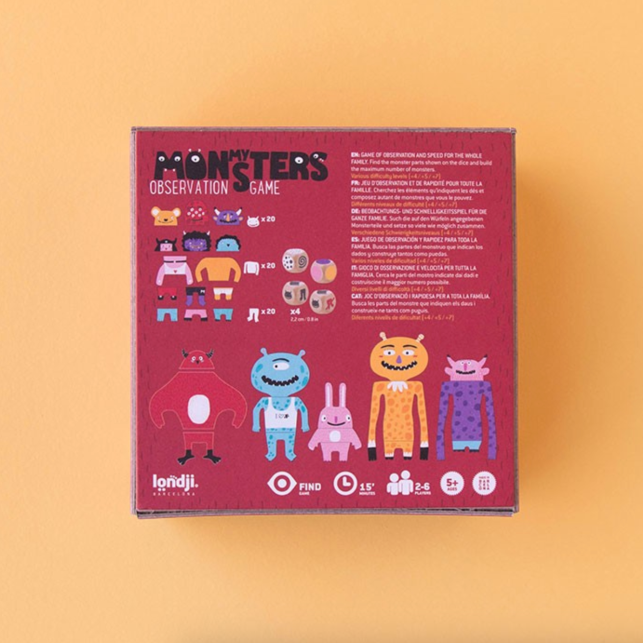 Once upon a time...moooooonsters! From colours, to spots, fur and scales ...Many different monsters to be made. A speed and observation game for all the family. Find the monster parts indicated by the dice and be the fastest to build as many as you can. A very fun game that stimulates hand-eye coordination and rewards logical deductions.