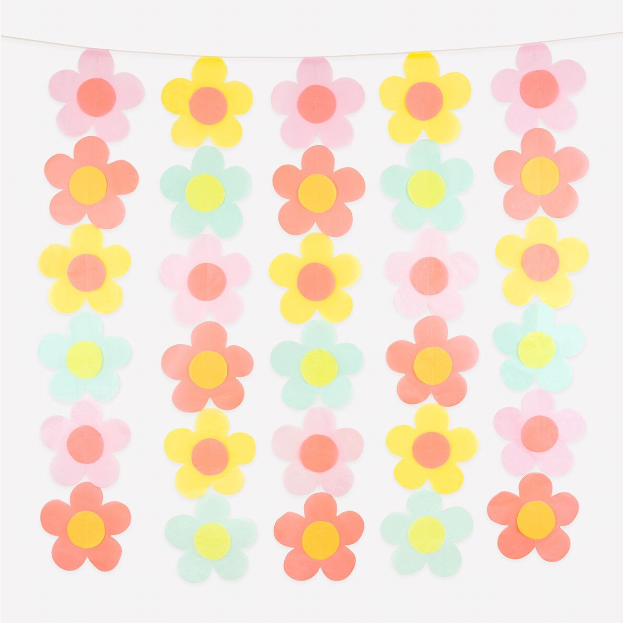 - Each strand consists of 6 printed paper flowers in 4 styles, in neon coral, mint, pink and yellow, with tissue paper middles