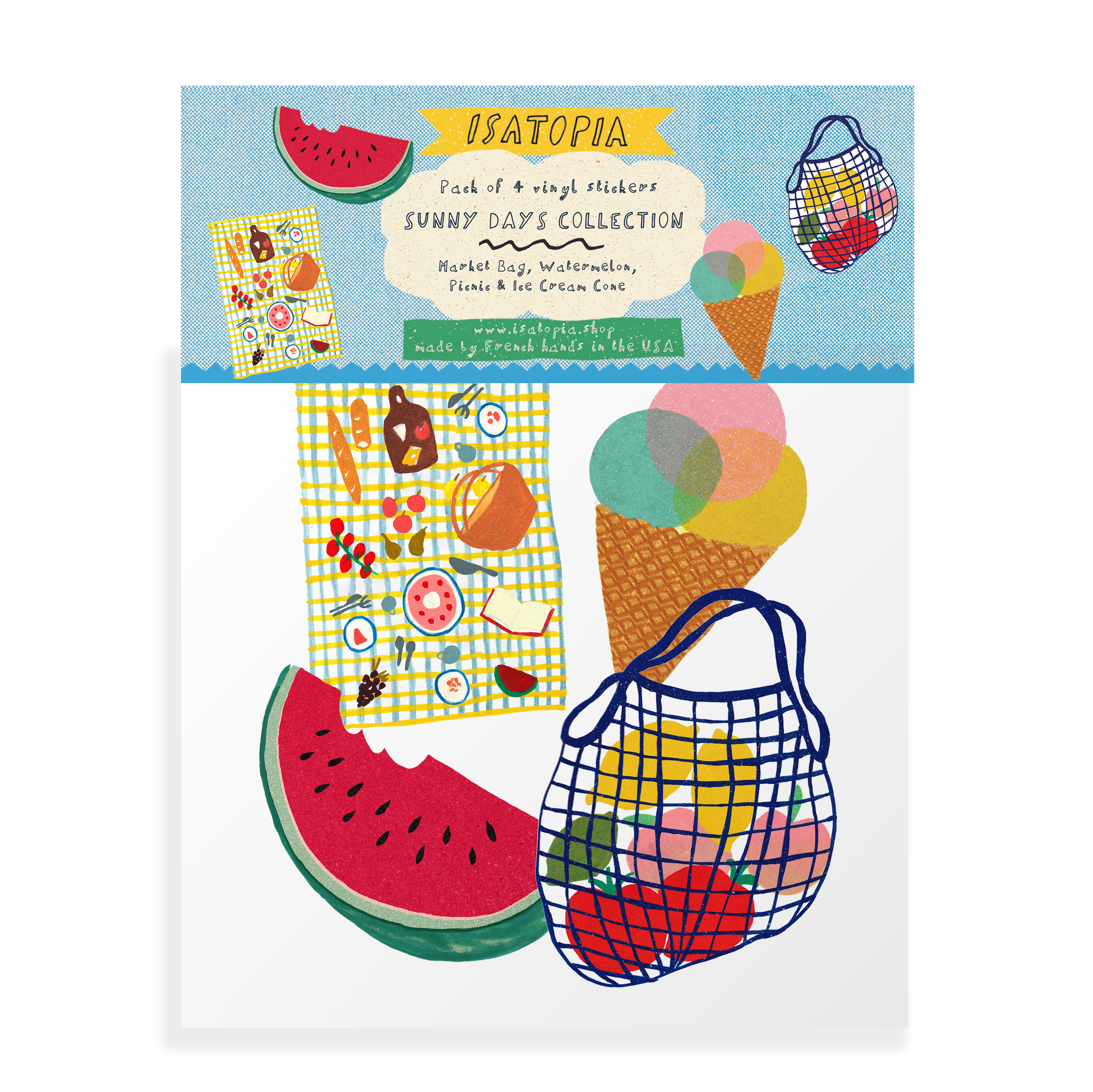 The Sunny Days sticker pack featuring the Picnic, the Market Bag and the Watermelon and the Ice Cream Cone - the sunniest sticker selection! Perfect for decorating notebooks, party bags, lunchboxes, or little love notes, these stickers bring the charm and mischief of the Wild Bunch to everyday fun The designs come from original illustrations made by Isabelle.
