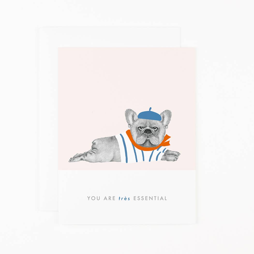 A hand drawn Frenchie in a beret and striped top text reads "You are trés Essential."